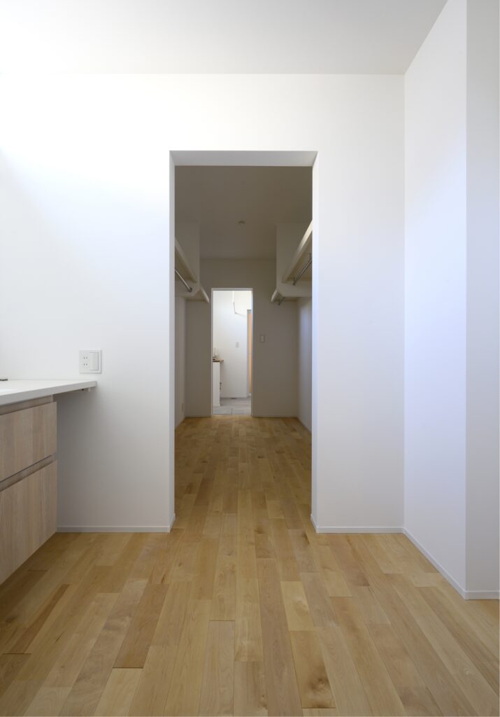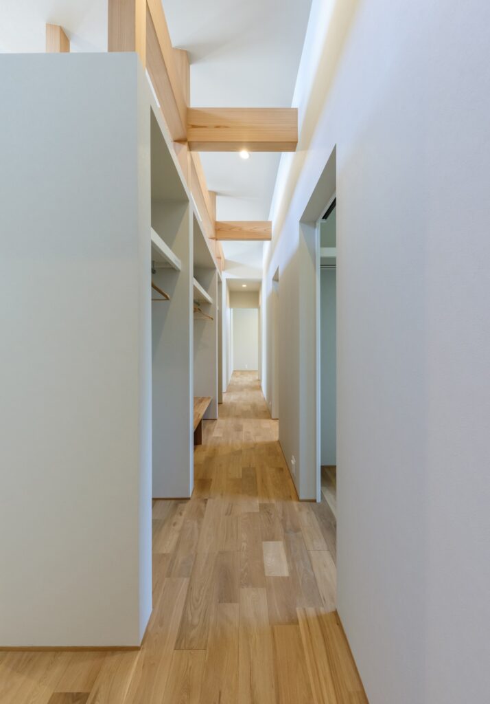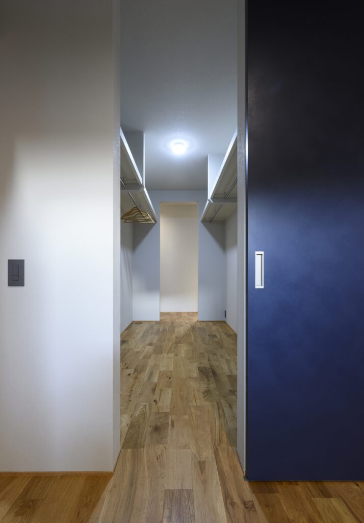 2つの部屋や廊下をつなぐ「通り抜けできる」収納スペース。通路として機能するため、移動のついでに衣類を出し入れでき、生活動線がスムーズになるのが最大の特徴です。玄関と脱衣室または玄関とリビングをつなぐ配置が人気。