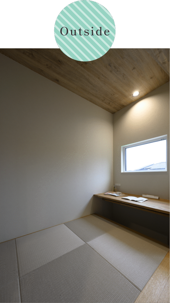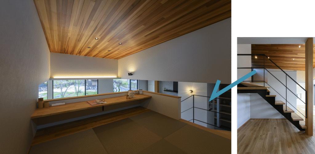 ▲家の中心に置いたスキップフロアのロフトスペース。畳で仕上げているため、お子様の遊び場やお昼寝、時には来客用としても使えます。