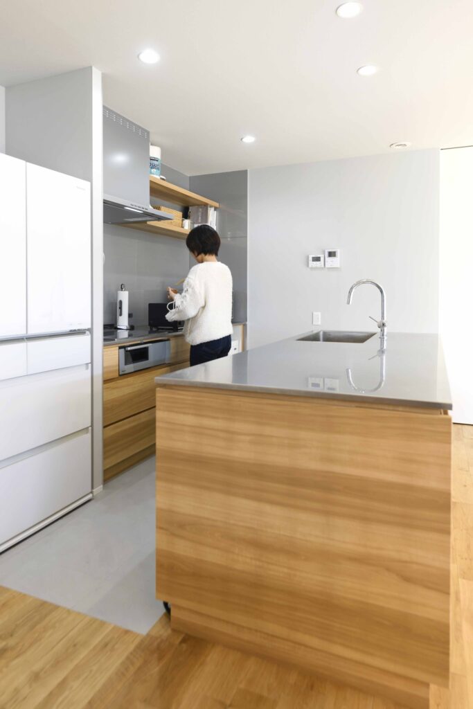「間取りやデザインでこだわったのはオーダーメイドのキッチンです。将来、新しいお家でお料理教室を開けたらいいなと思っていたので、イチから造ってもらいました。キッチンの前を収納にしたことで、子どもが自分でお皿を出したり、とお手伝いをしてくれるようになりました。」