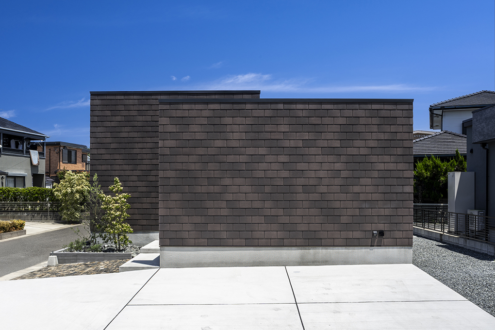 無機質な素材感を最大限にいかすために、外壁には土を想像させる重めのブラウンカラーをセレクトしました。周囲の町並みにも良くなじみ、存在感を感じさせながらもどこかほっとする佇まいです。