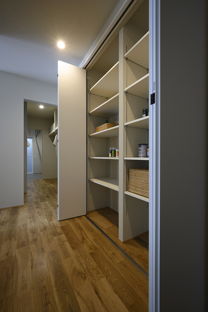 ダイニング横にパントリーとして使えるように豊富な収納クローゼットを施工しました。