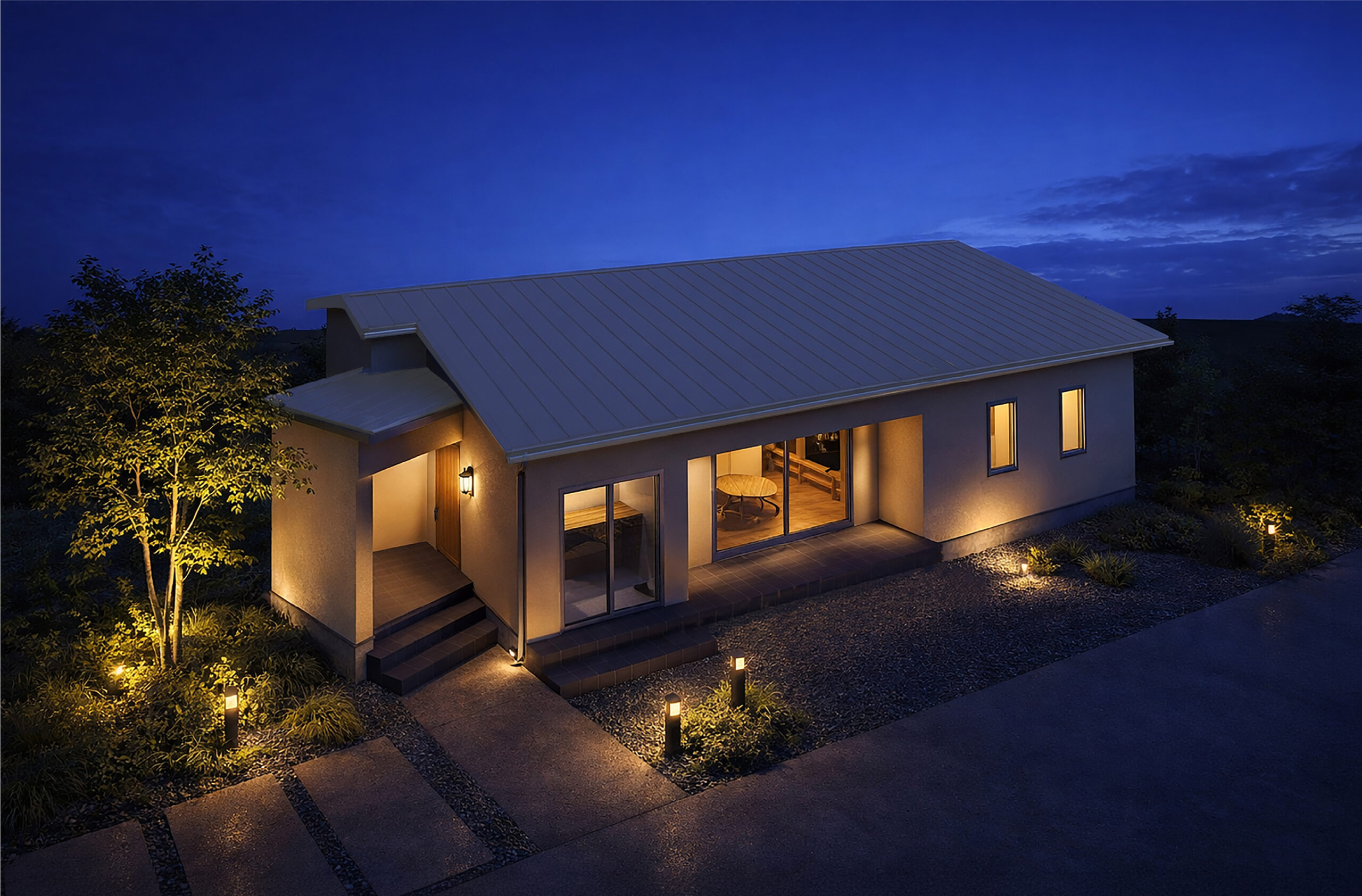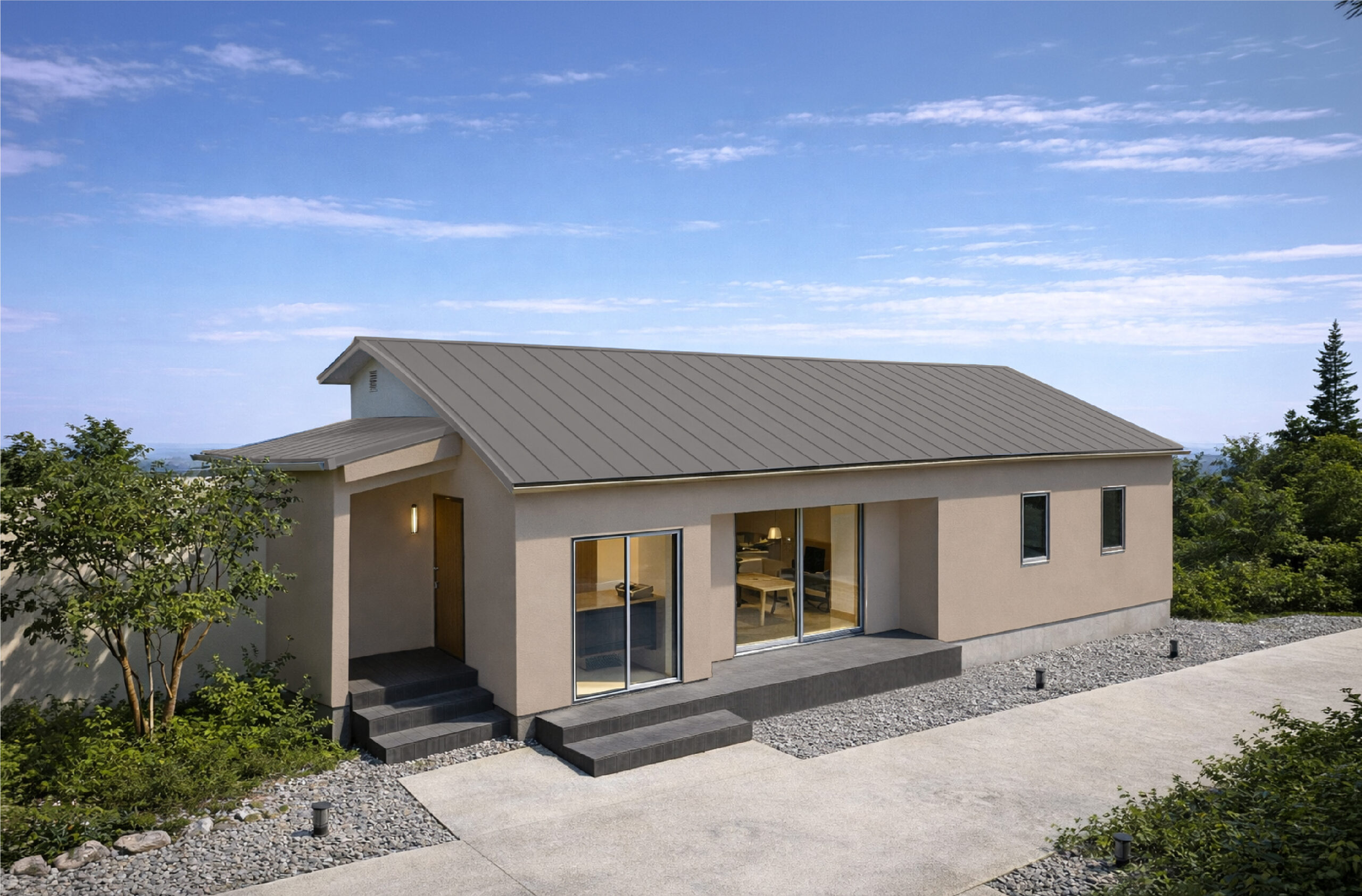 深い軒と温かみのある色の塗り壁で構成した落ち着きのある和モダンスタイル。軒が風雨から家全体を守る役割を果たしてくれるためダメージを最小限に抑えられます。