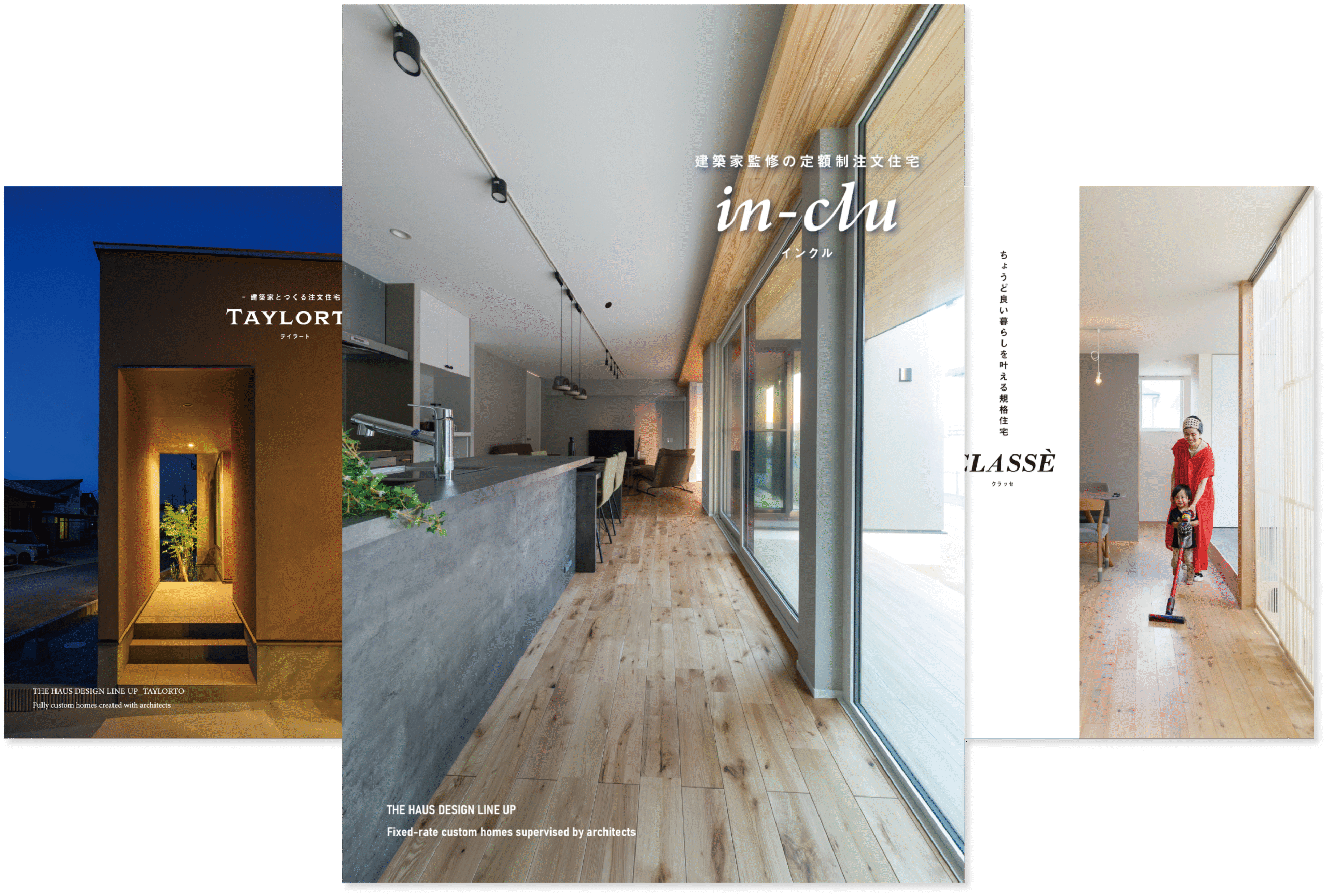 ご家族のご要望に対応できるようにご用意している「建築家監修の定額制注文住宅“In-clu(インクル)”」の他「建築家とつくる注文住宅“TAYLORTO(テイラート)”」「規格住宅“CLASSE(クラッセ)”」の商品カタログもご用意しています。それぞれの特徴をわかりやすくまとめおりますので、ぜひご覧ください。
