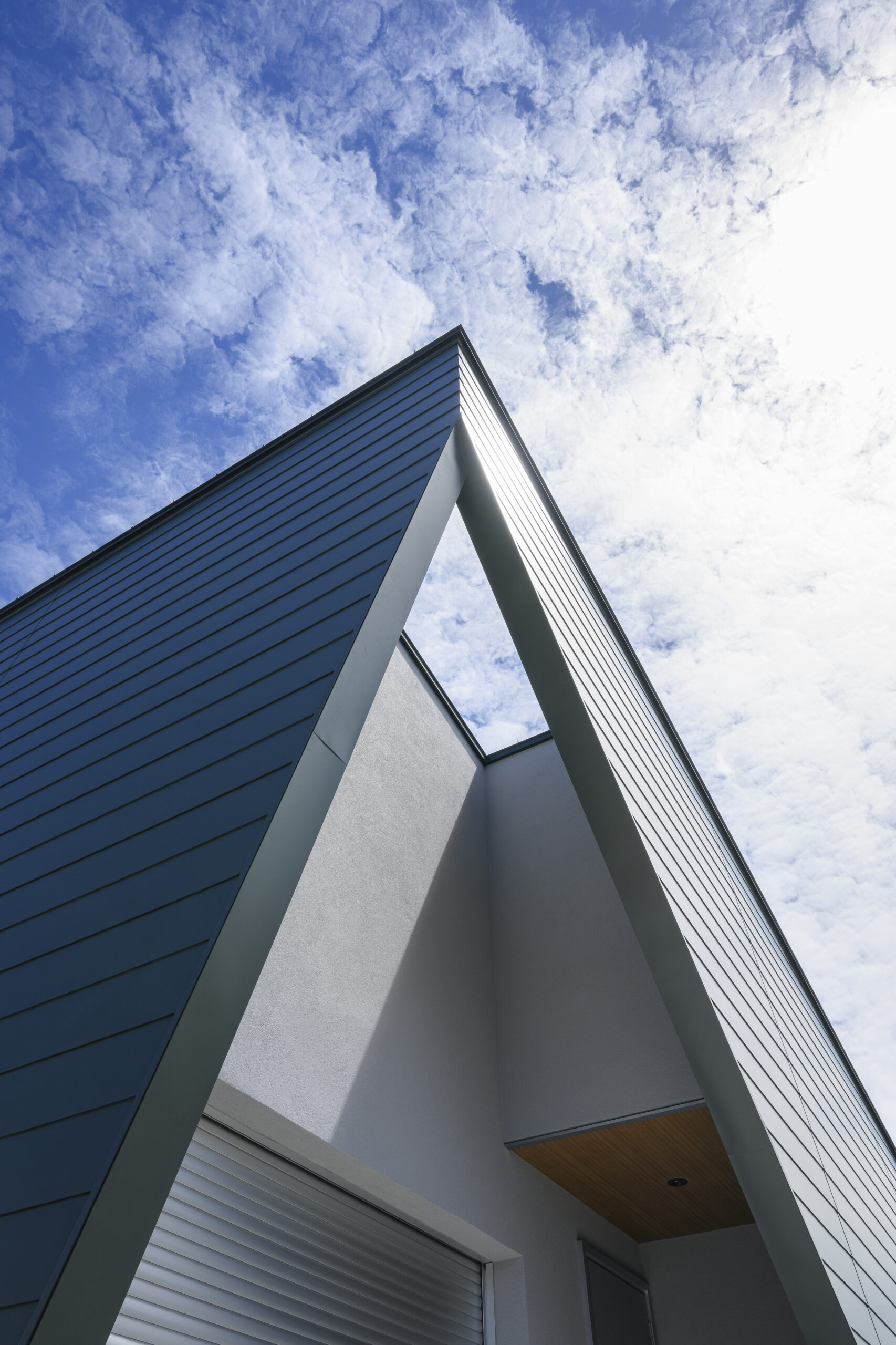 片流れのスタイリッシュな形に、エントランスホールのBOX部分をA型のスリットにして存在感のある外観ファサードに。思わず一目惚れしそうな佇まいです。