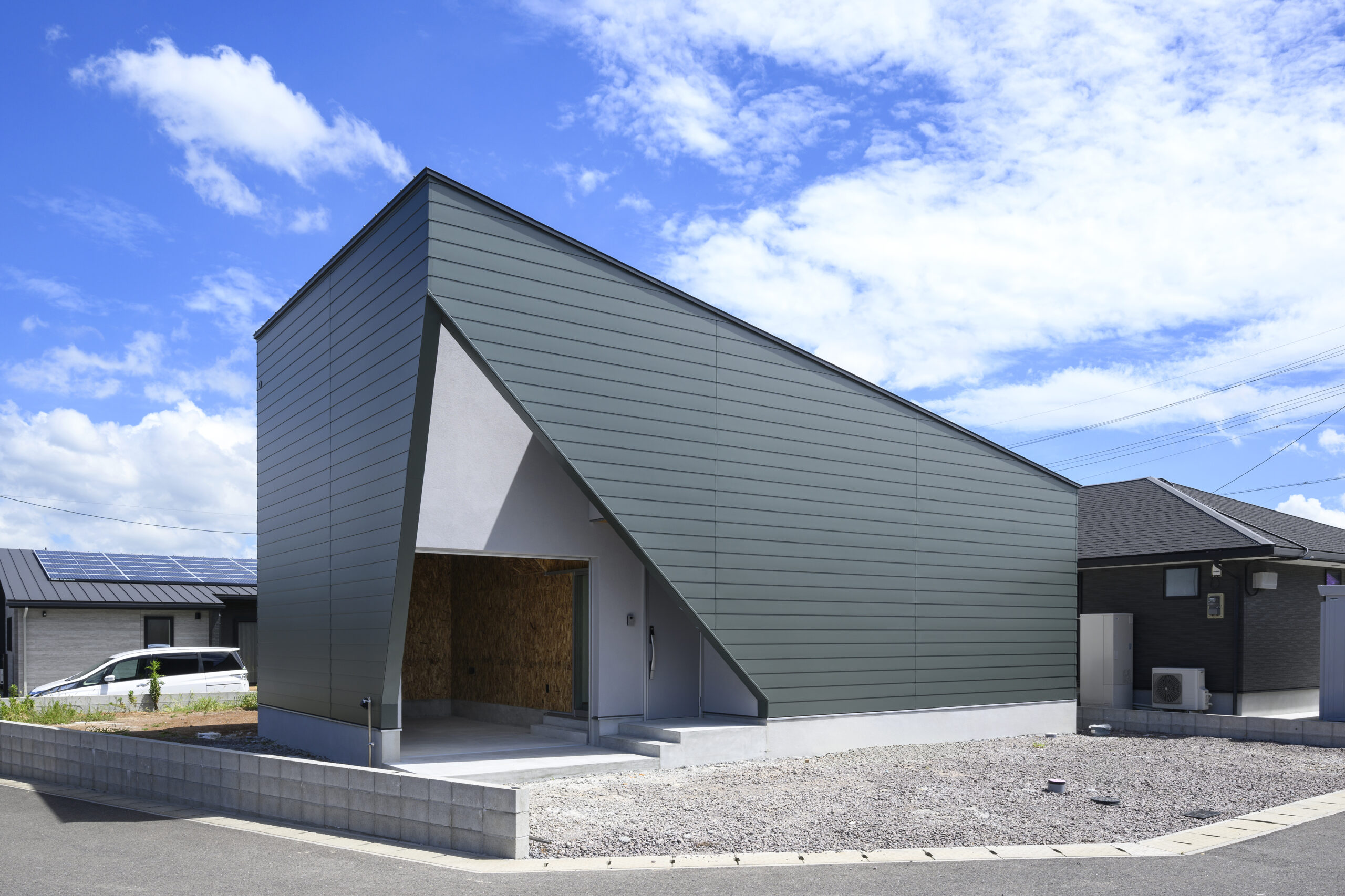 片流れのスタイリッシュな形に、エントランスホールのBOX部分をA型のスリットにして存在感のある外観ファサードに。思わず一目惚れしそうな佇まいです。