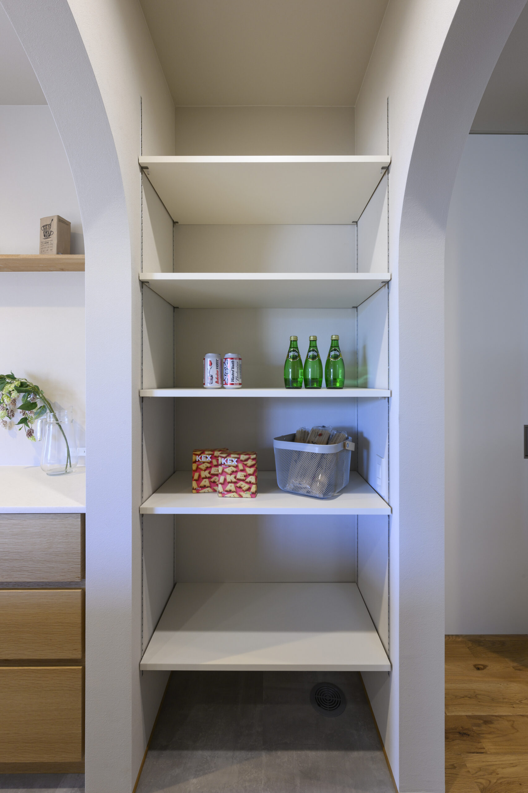 カップボード上には段違いの飾り棚を設置。お気に入りのカップや雑貨を飾ればカフェのようなオシャレ空間のできあがりです。