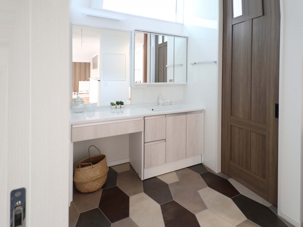 白を基調にして清潔感を出しながら、床はシックなカラーで存在感のあるデザインタイルを採用しました。まるでホテルのような品の良い上質な仕上がりに。洗面化粧台は清掃性を考えてシンプルなタイプに。