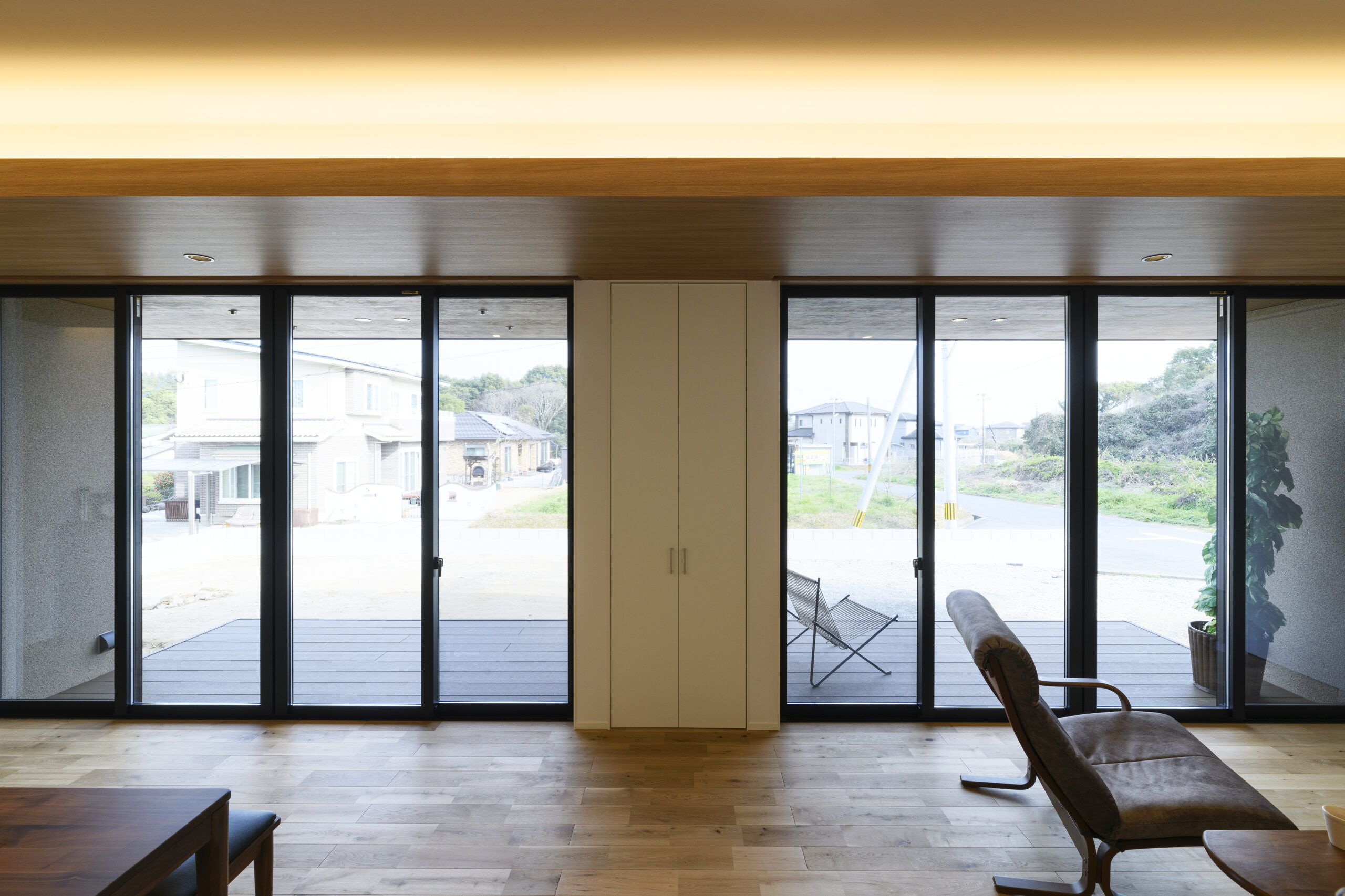 室内の天井板とデッキの軒天を1枚でつなげました。空間に拡がりと奥行き感を感じられるように施した工夫です。