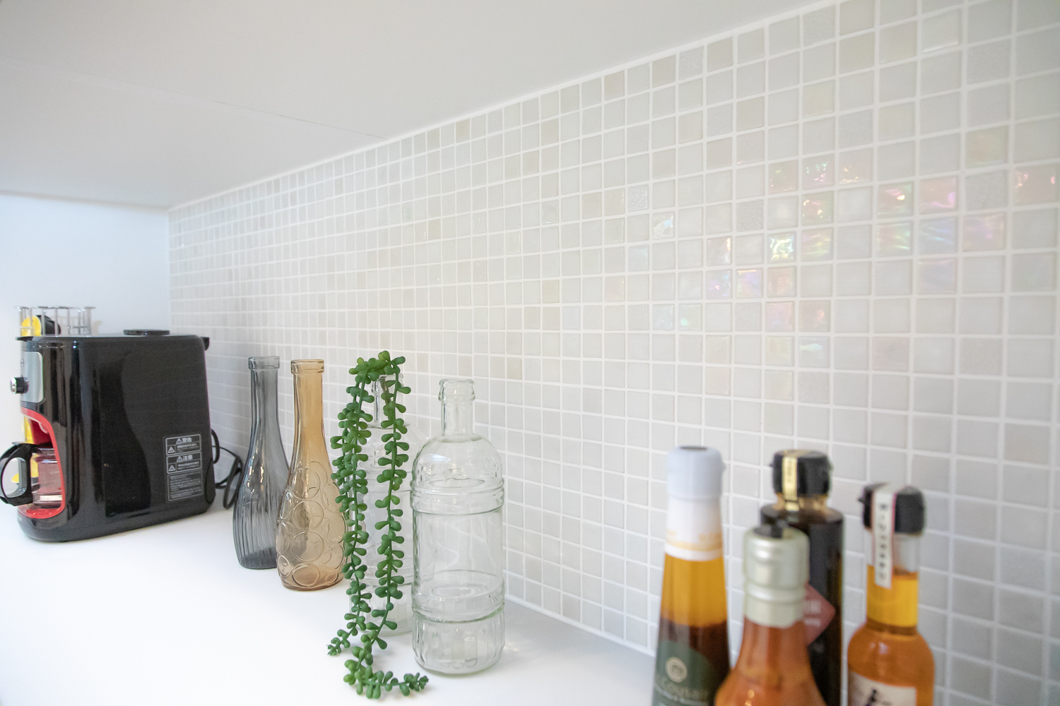 回遊性を高めるアイランドキッチンを採用。さらに料理中や片付け時に何かと便利なカウンターも配置しました。背面には淡いカラーを多色使いしたモザイクタイルを施して、オリジナル性を高めています。