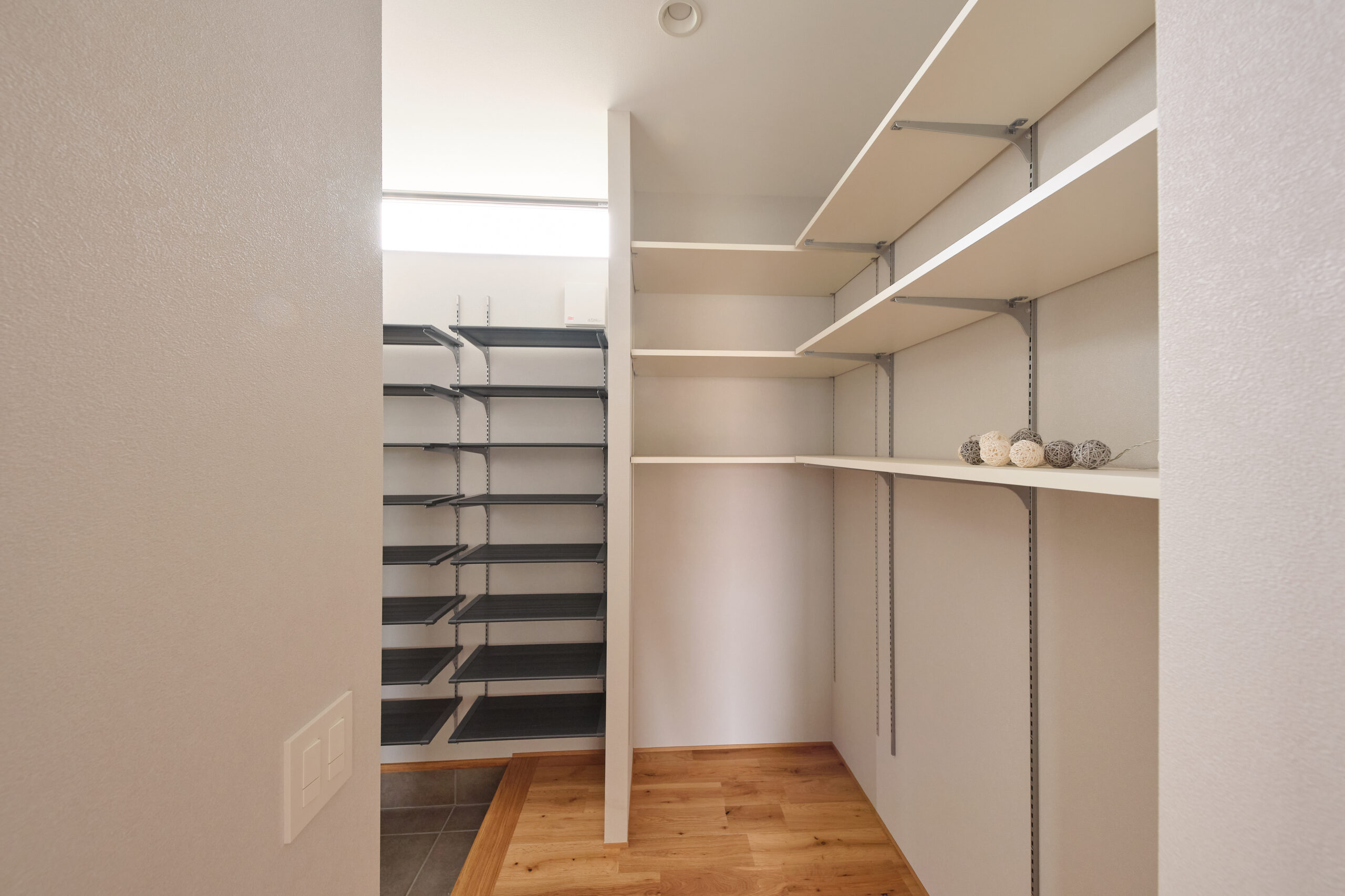 ファミリークロークに2つの出入り口を施工して、廊下代わりに通り抜けできるようにしました。なるべくデッドスペースを省いて、その分、他の空間にゆとりを持たせました。