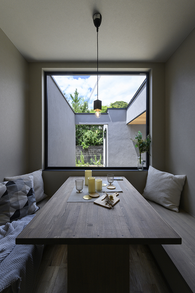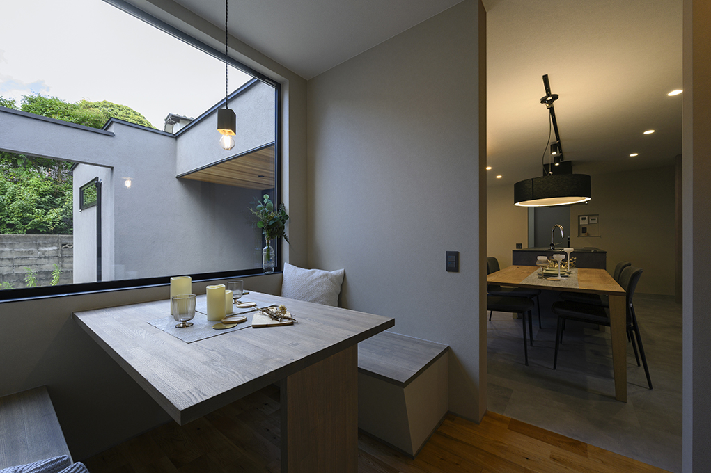 リビングの一角に設けたヌックは夫婦2人の時間を愉しむための特等席。オリジナルの造作テーブルやベンチ、そしてそこから眺める中庭の景色が日常の暮らしを豊かに彩ります。
