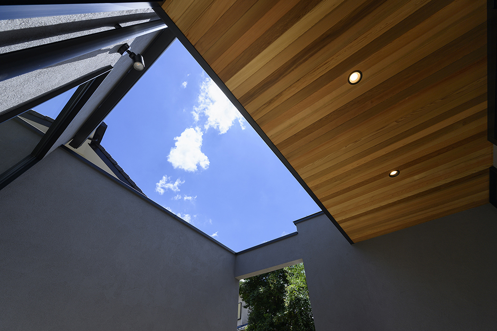 壁で周囲からの遮る分、軒天には開口を設けて開放感をつくりました。心地よい陽射しと風を感じられます。