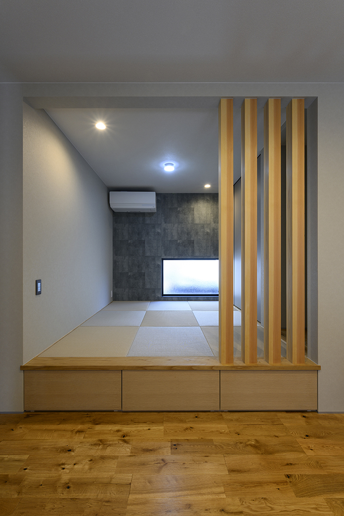 小上がりにした和室と床の段差を活用して収納機能をプラス。扉は床材と合わせてオーク材に。