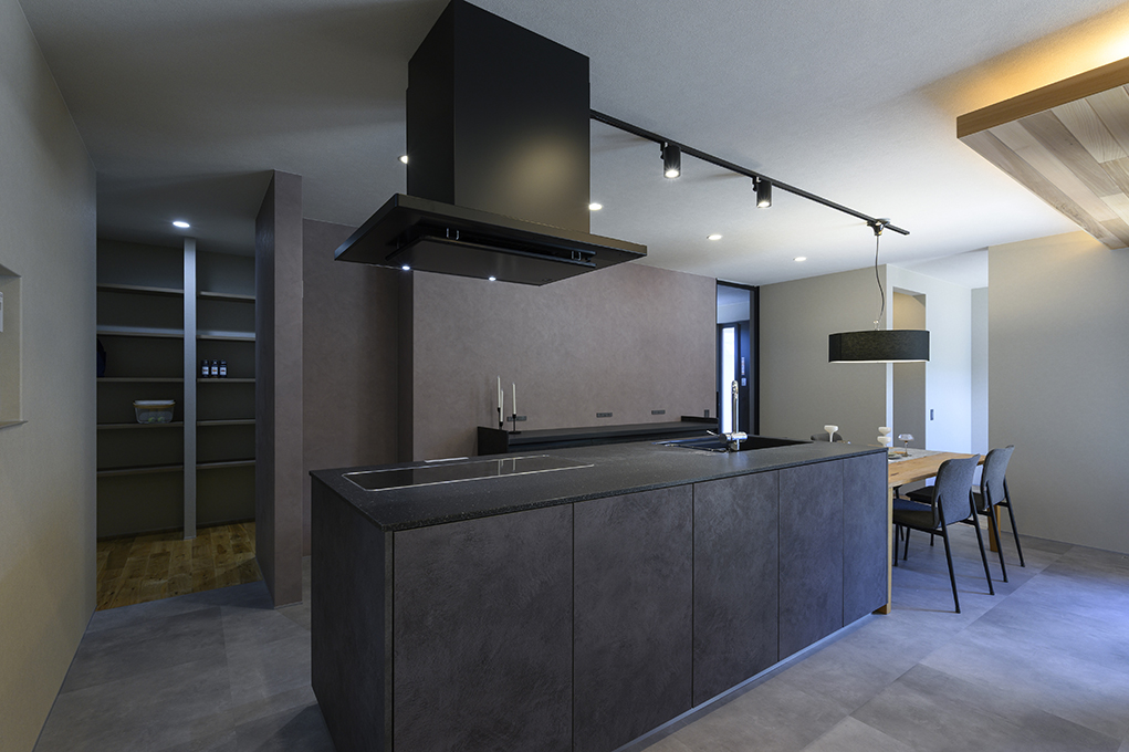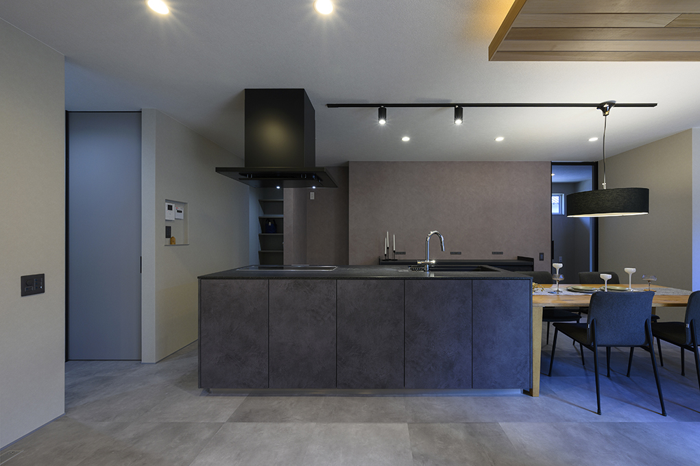 フロアタイルを使って仕上げたホテルライクなキッチン&ダイニング
