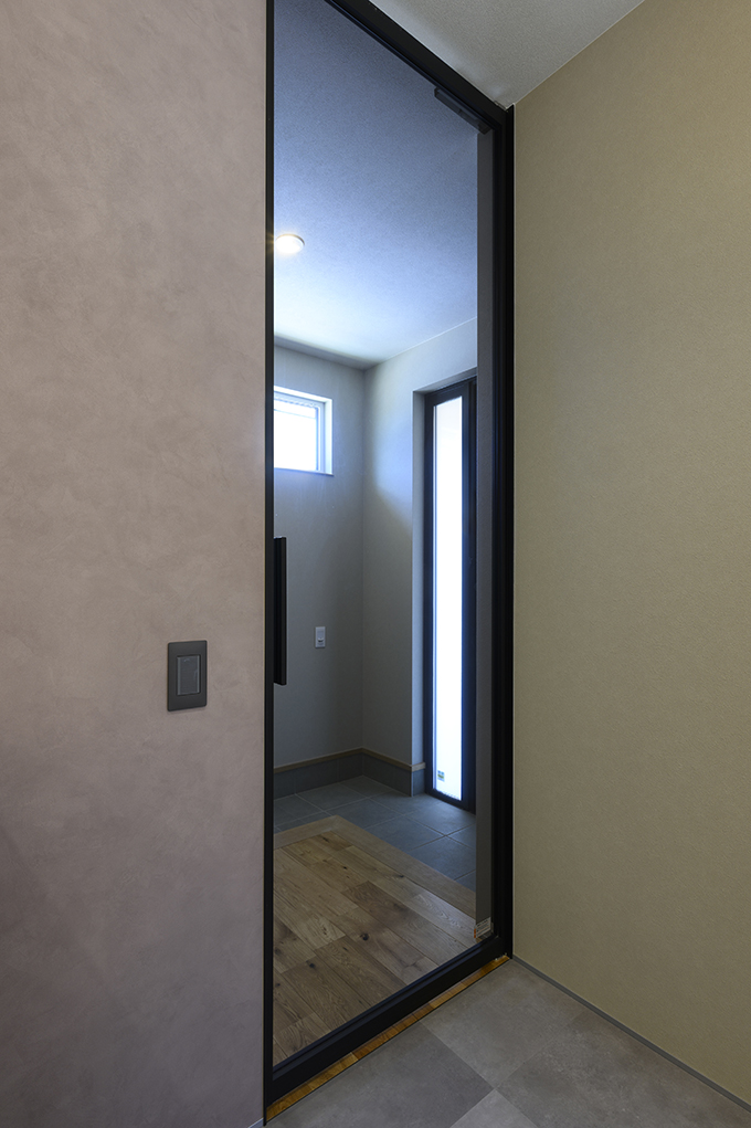 スタイリッシュな細めのフレームが特徴のガラスドア。空間を区切りながらも視覚的な広がりやつながりを感じさせてくれます。