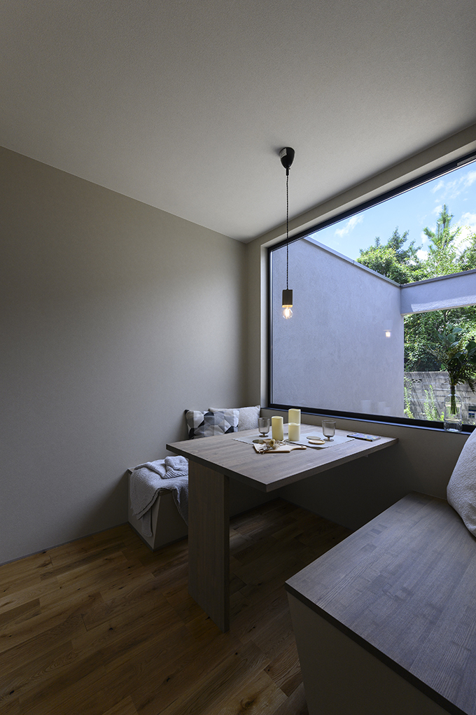 リビングの一角に設けたヌックは夫婦2人の時間を愉しむための特等席。オリジナルの造作テーブルやベンチ、そしてそこから眺める中庭の景色が日常の暮らしを豊かに彩ります。