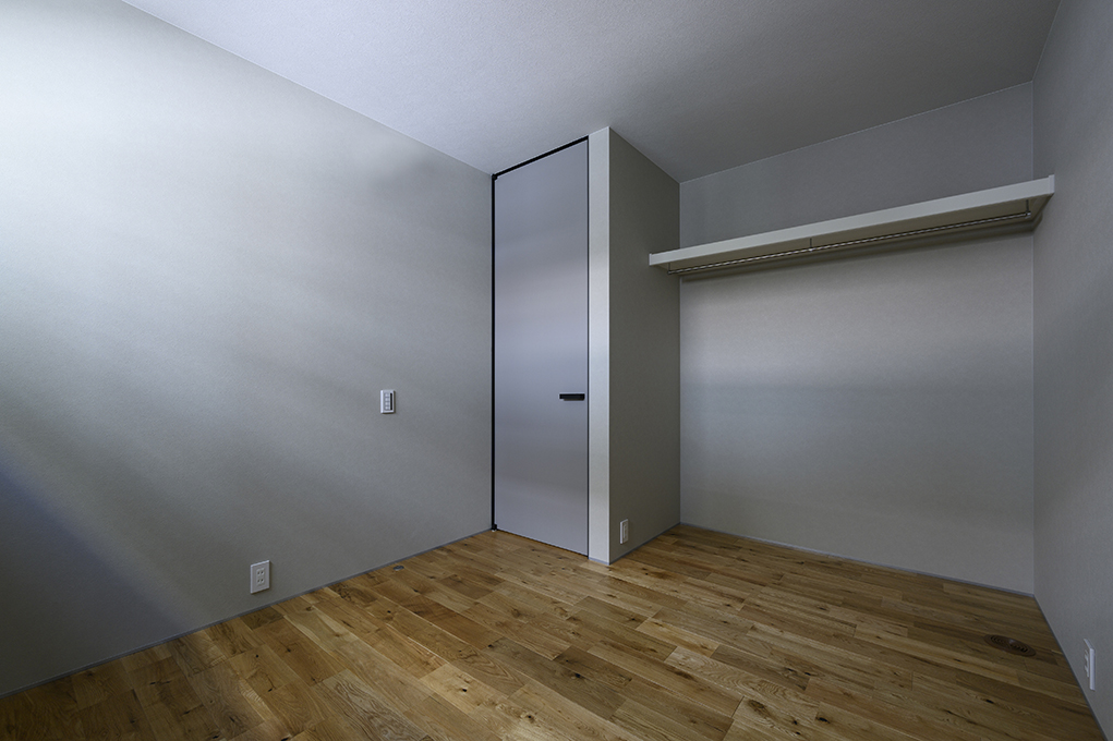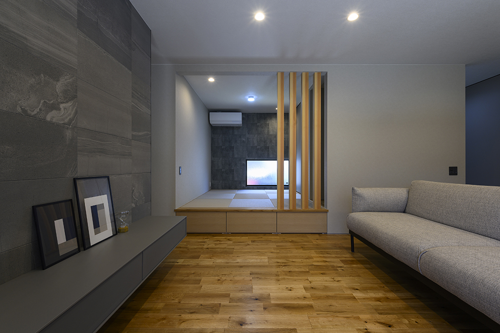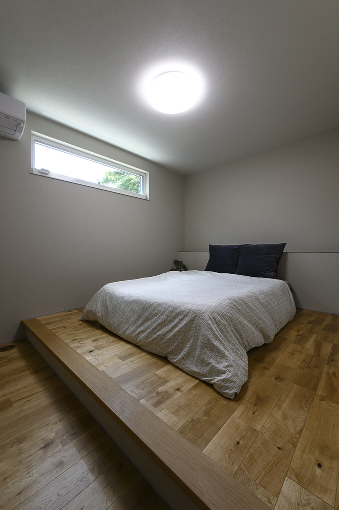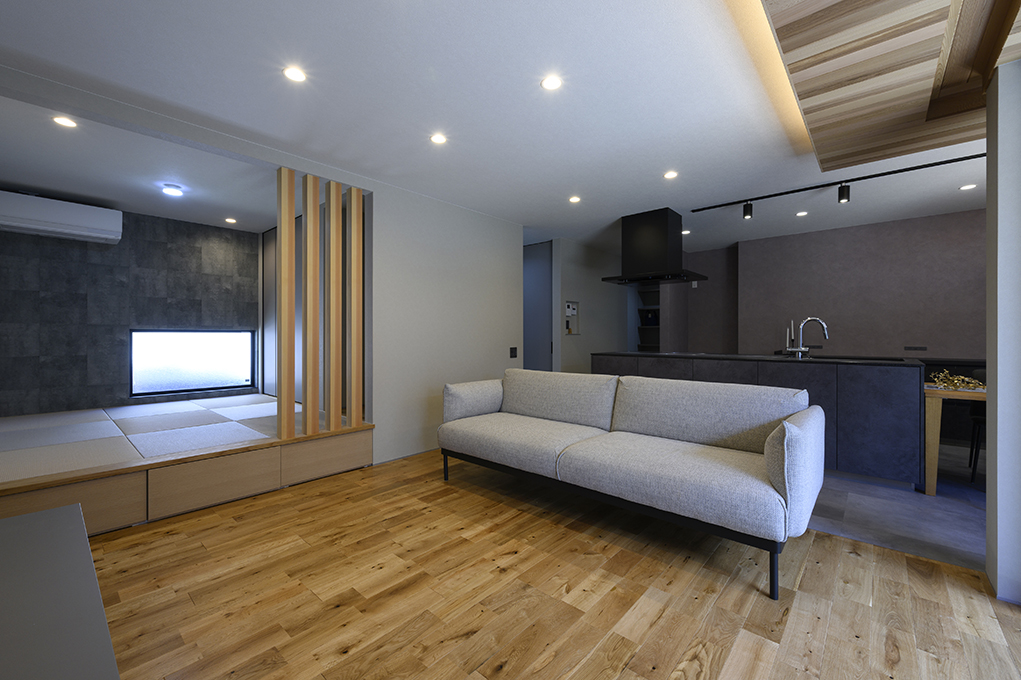 小上がりにした和室と床の段差を活用して収納機能をプラス。扉は床材と合わせてオーク材に。