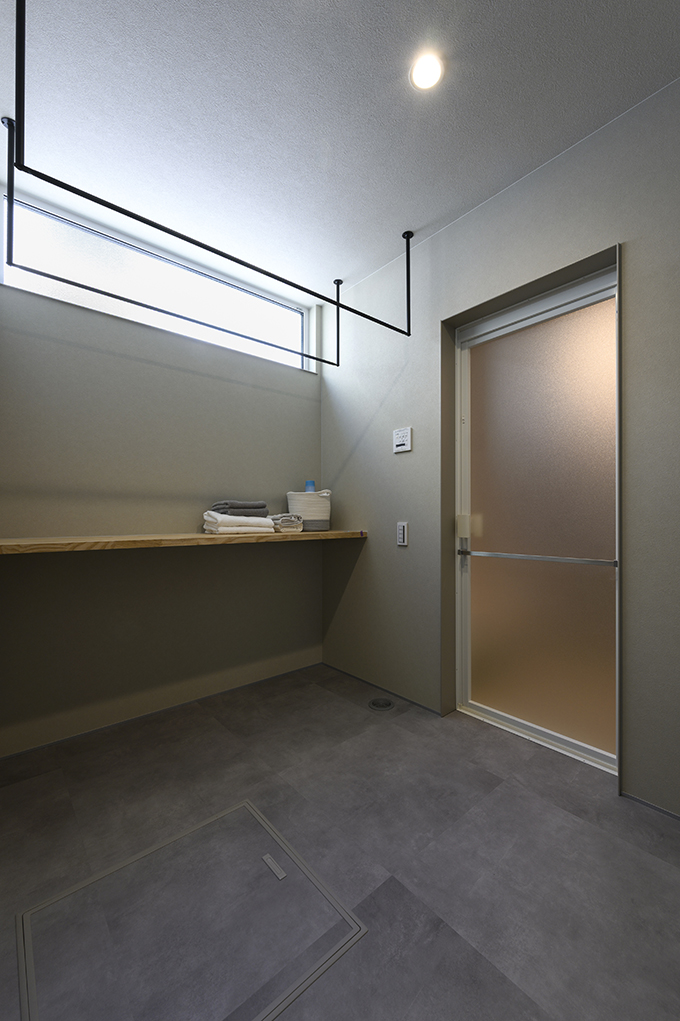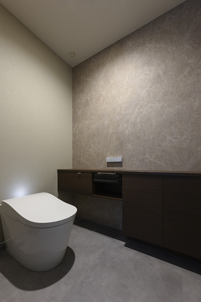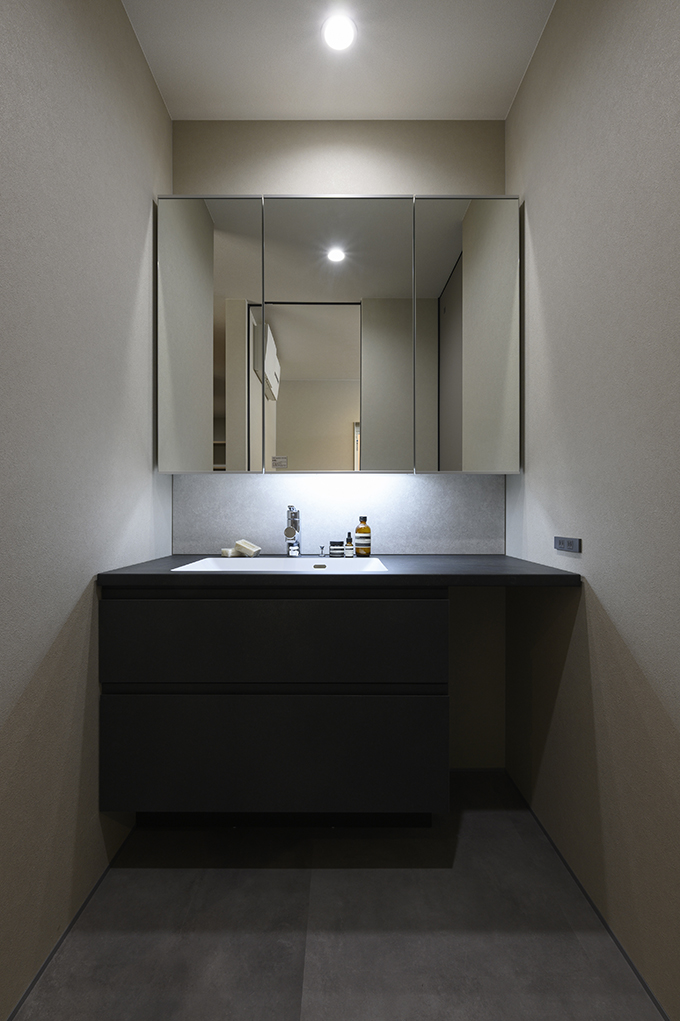水まわりとダイニングにはお手入れがラクラクなフロアタイルを採用。その無機質な風合いとアルミ調の巾木を組み合わせて生活感を感じさせない、ホテルライなコーディネートに仕上げました。