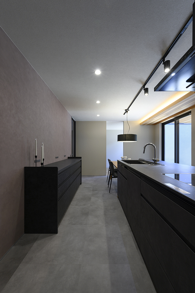 フロアタイルを使って仕上げたホテルライクなキッチン&ダイニング