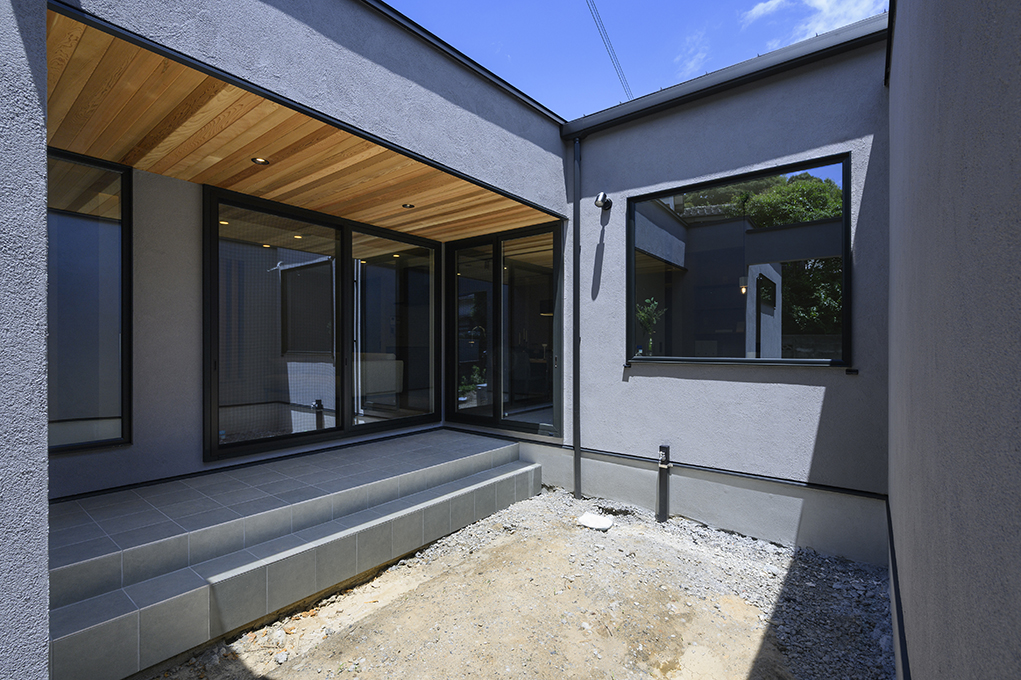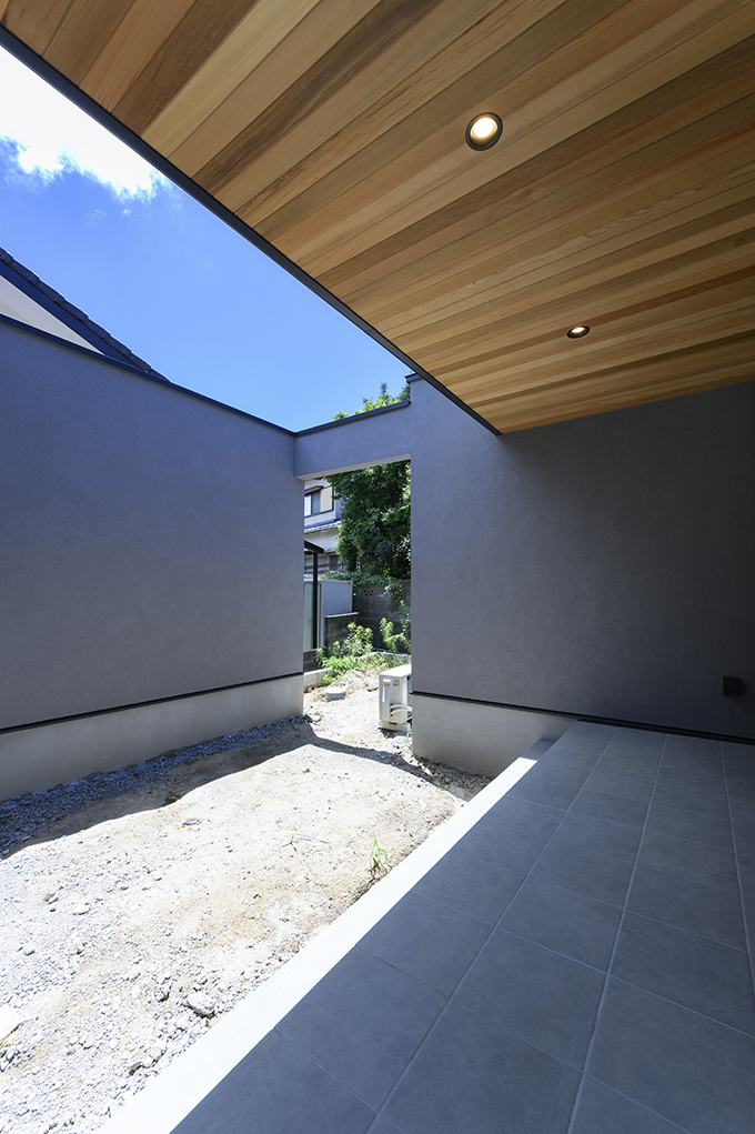 壁で周囲からの遮る分、軒天には開口を設けて開放感をつくりました。心地よい陽射しと風を感じられます。