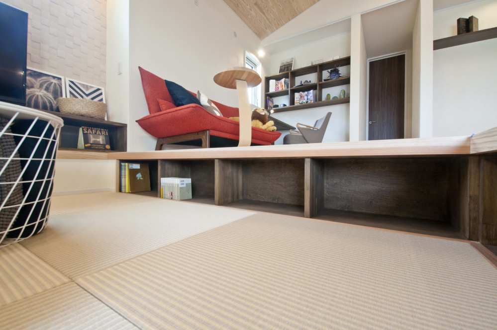 段差にも収納スペースを設けて、本を並べられるように配慮しました。