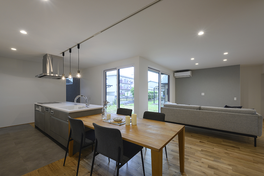 キッチンまわりをぐるぐる廻れる回遊性のあるアイランドキッチンと、横並びに配置したサイドダイニングの組み合わせで家事効率がUPします。