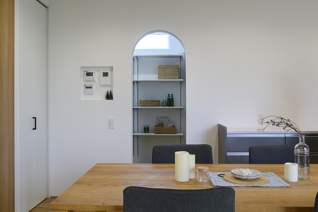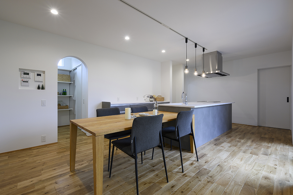 リビングダイニングと水まわりゾーンをアーチの垂れ壁でゆるやかに仕切りました。移動のしやすさと美しさを両立させた機能美のある空間です。