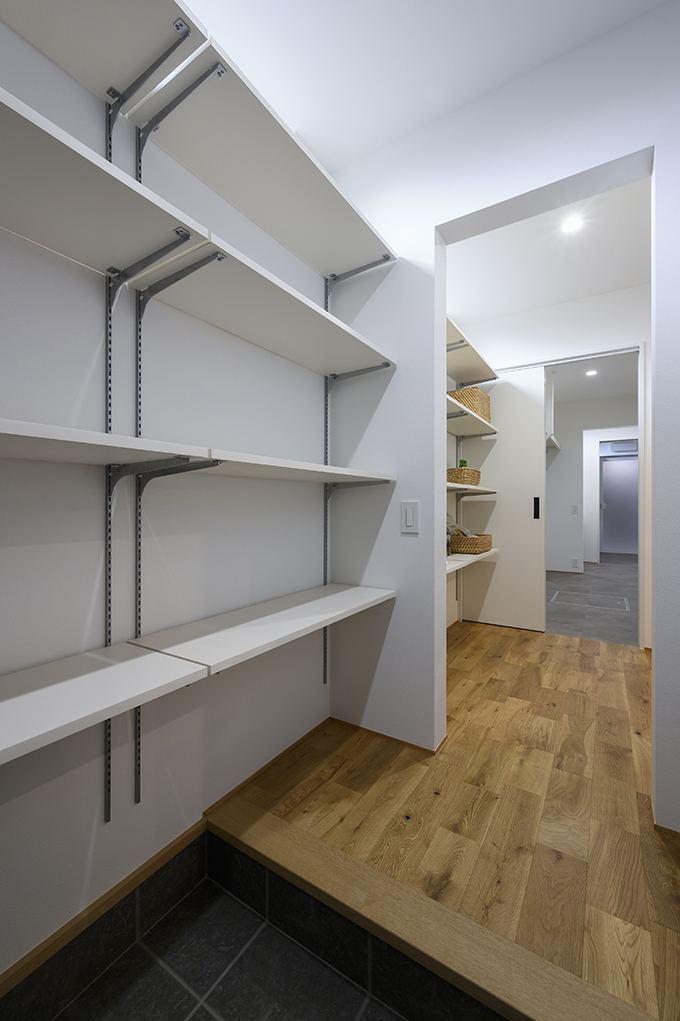 玄関入ってから、『パントリー→ファミリクローク→洗面カウンター→脱衣室→浴室』までを一直線でつなげました。お客様に生活空間を見られる心配がなく、まとめ掃除ができるため、時短につながります。