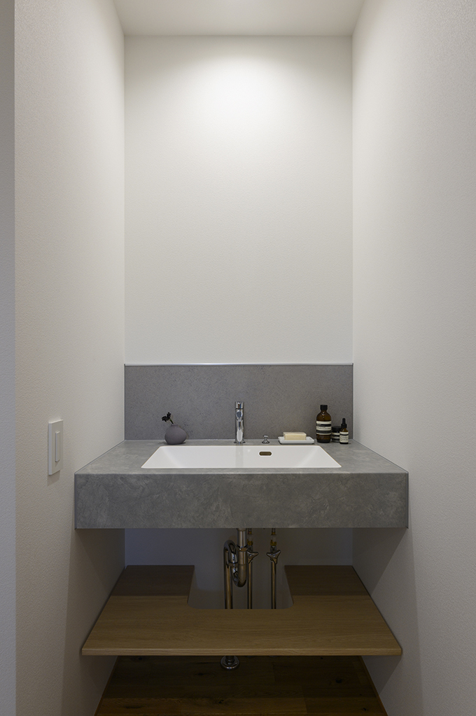 木の温かさと柔らかさがつくる心地よさに、モルタル調の洗練された質感でモダンな印象を添えました。異なる質感の絶妙な組み合わせが生み出した上質なバランスが魅力です。