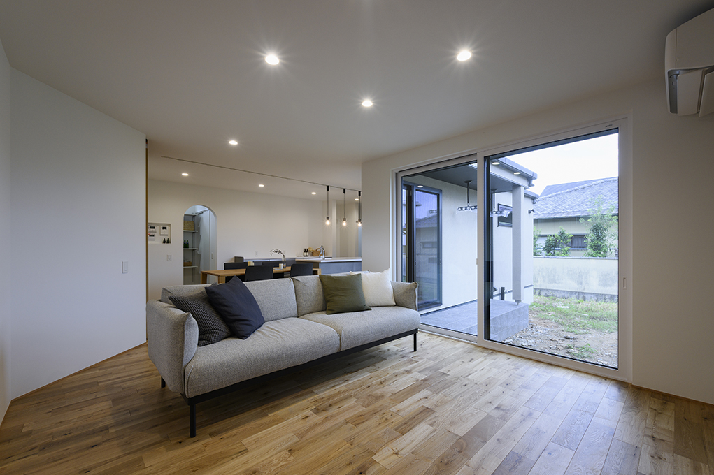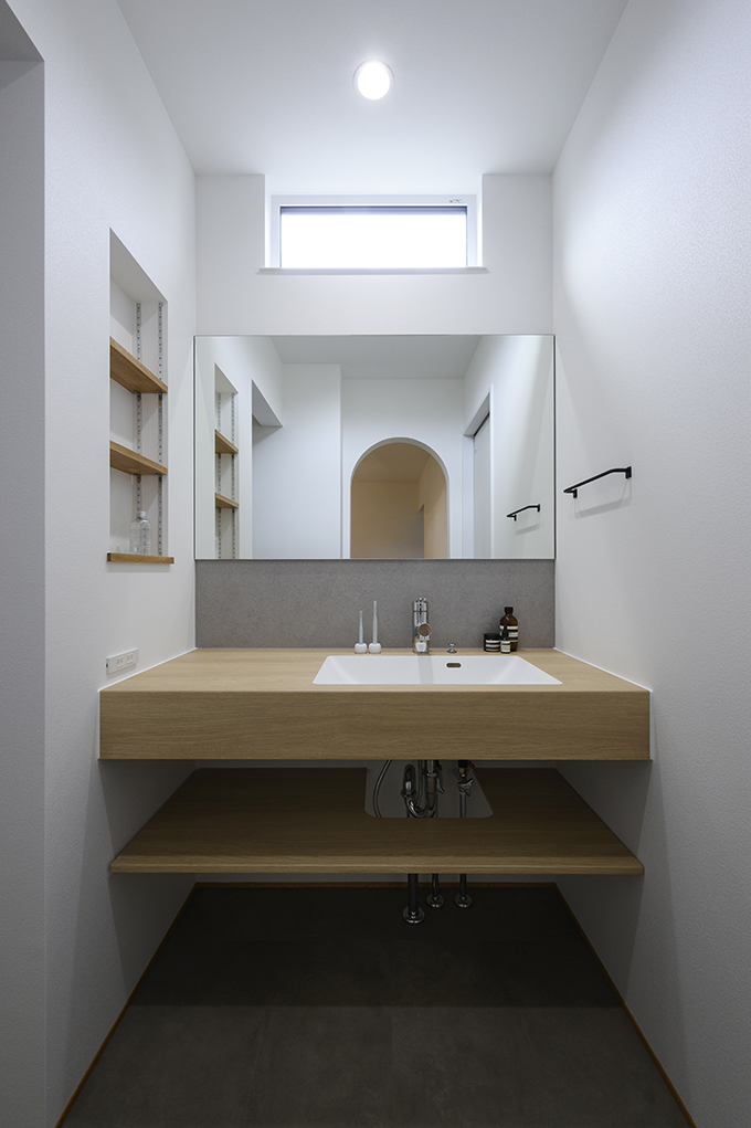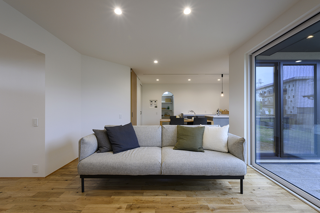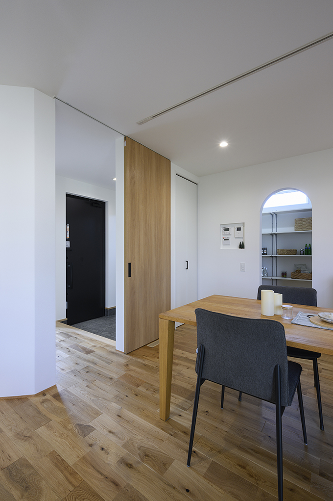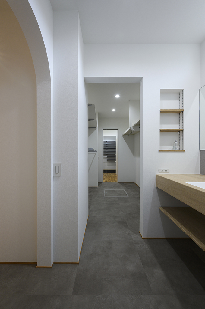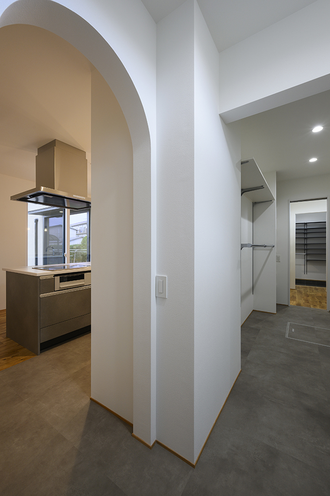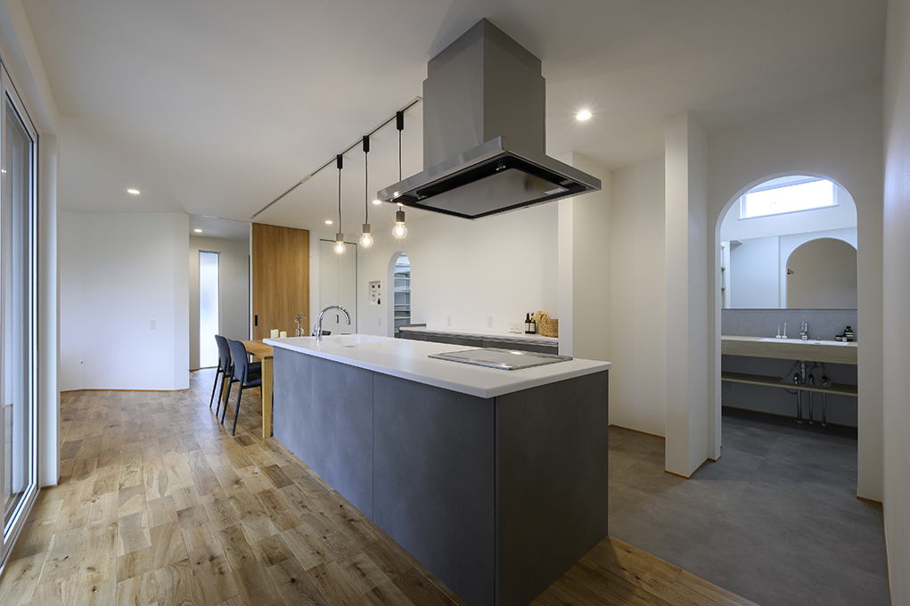 リビングダイニングと水まわりゾーンをアーチの垂れ壁でゆるやかに仕切りました。移動のしやすさと美しさを両立させた機能美のある空間です。