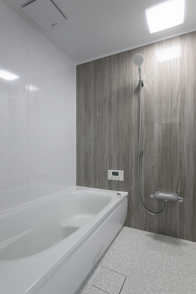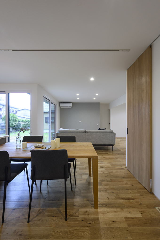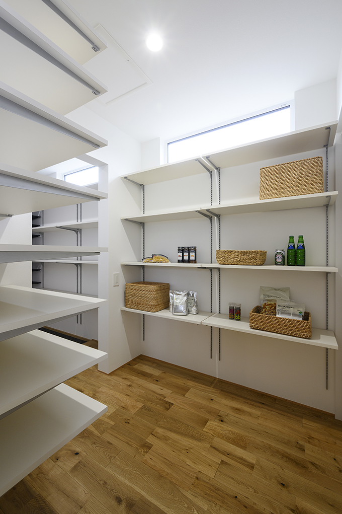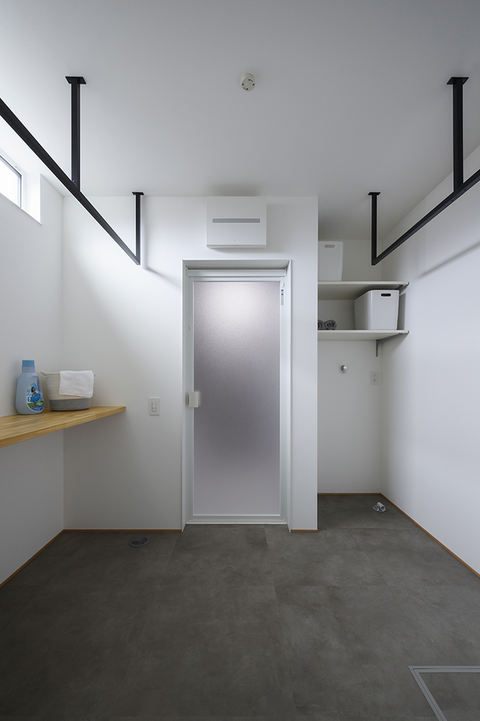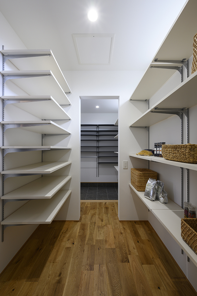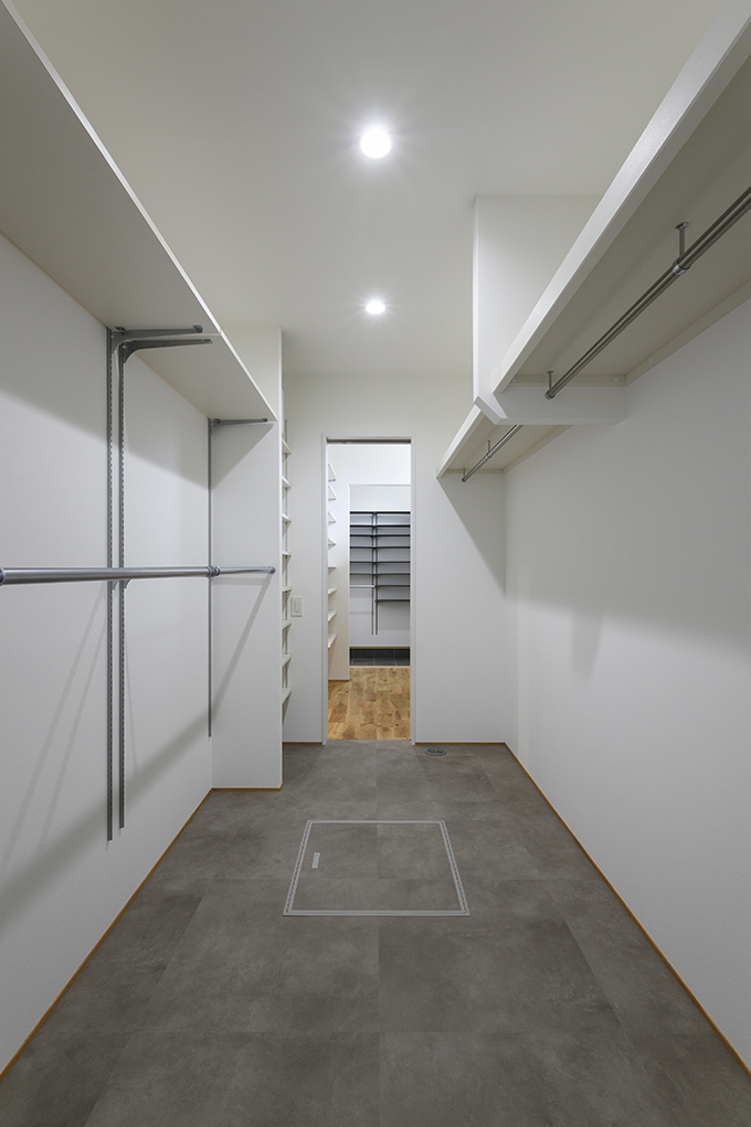 玄関入ってから、『パントリー→ファミリクローク→洗面カウンター→脱衣室→浴室』までを一直線でつなげました。お客様に生活空間を見られる心配がなく、まとめ掃除ができるため、時短につながります。