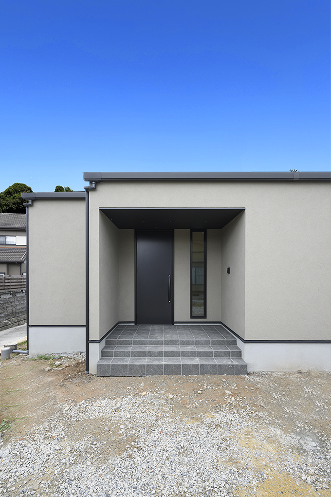 外観のアクセントとしてブラックの玄関扉や庇、サッシをセレクト。建物をギュッと引き締め、洗練されたスタイリッシュさを感じさせる佇まいです。