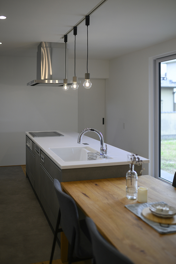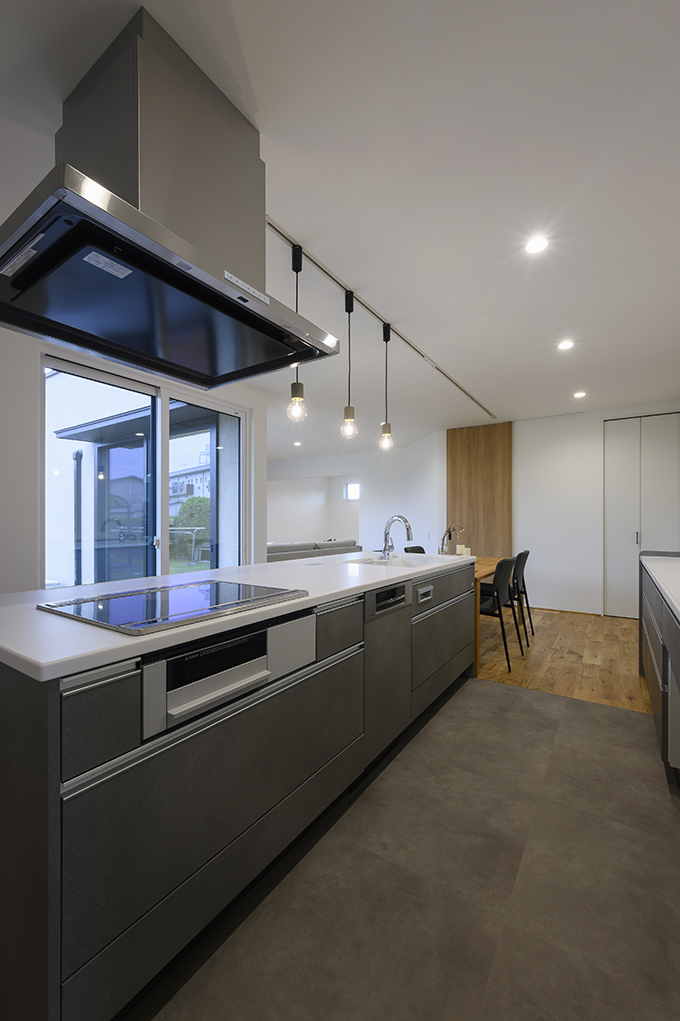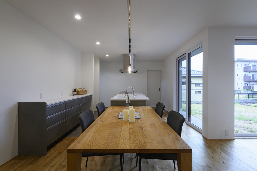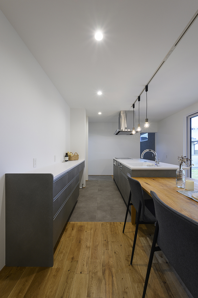 キッチンまわりをぐるぐる廻れる回遊性のあるアイランドキッチンと、横並びに配置したサイドダイニングの組み合わせで家事効率がUPします。
