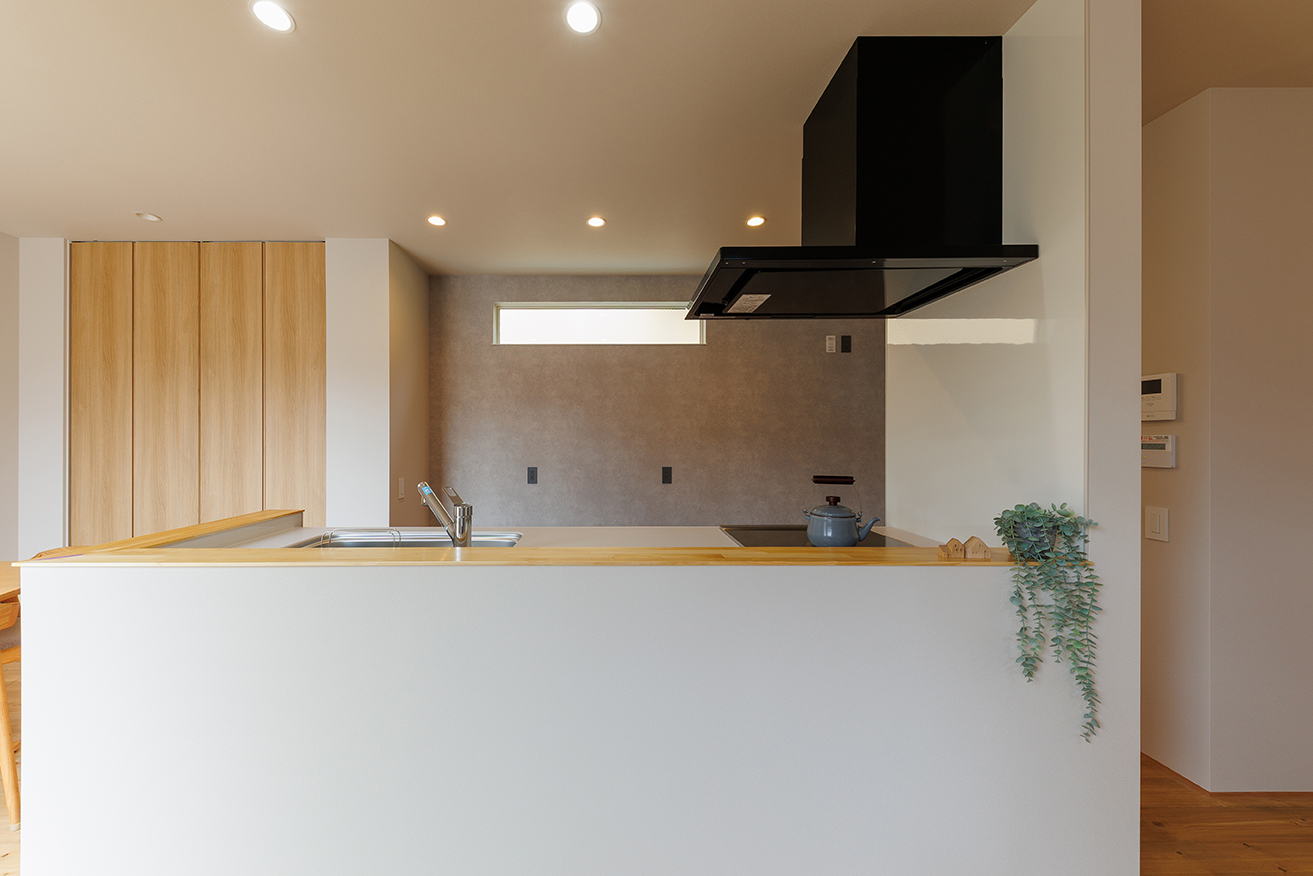 キッチンの腰壁を低くすることで開放的で、リビングやダイニングとのつながりを感じられます。