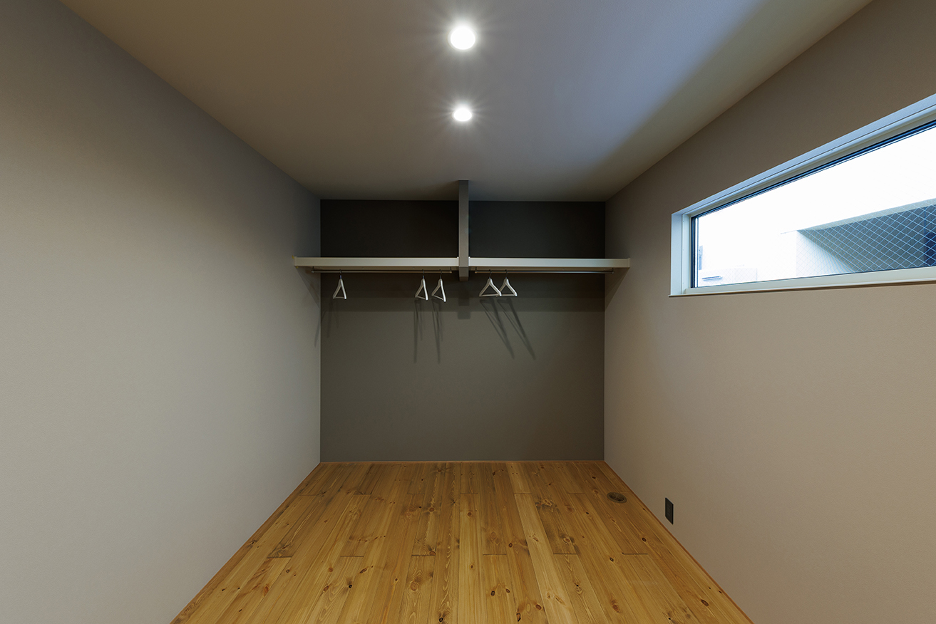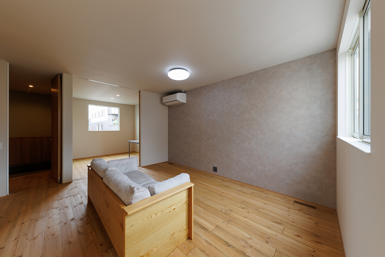 建具を引込みできるように2枚片引戸のタイプを採用して薄壁を施工。開けた時に建具が壁に隠れるため、開放感抜群です。