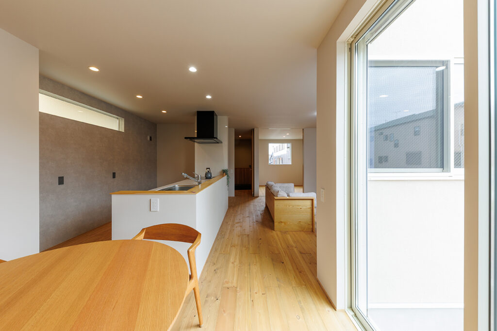 奥行きを出して凹みをつけることで二面採光に。採光が難しい狭小地にありながら、しっかりを光を室内に届けます。