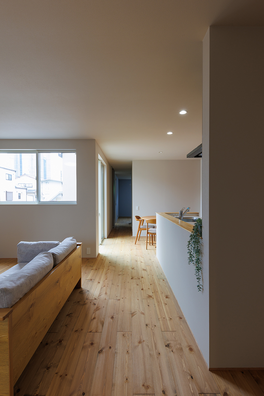 家族がくつろいだり、お客様を招くLDKと、寝室や水まわりなどのプライベート空間を廊下で分離。生活感を感じさせない間取りです。