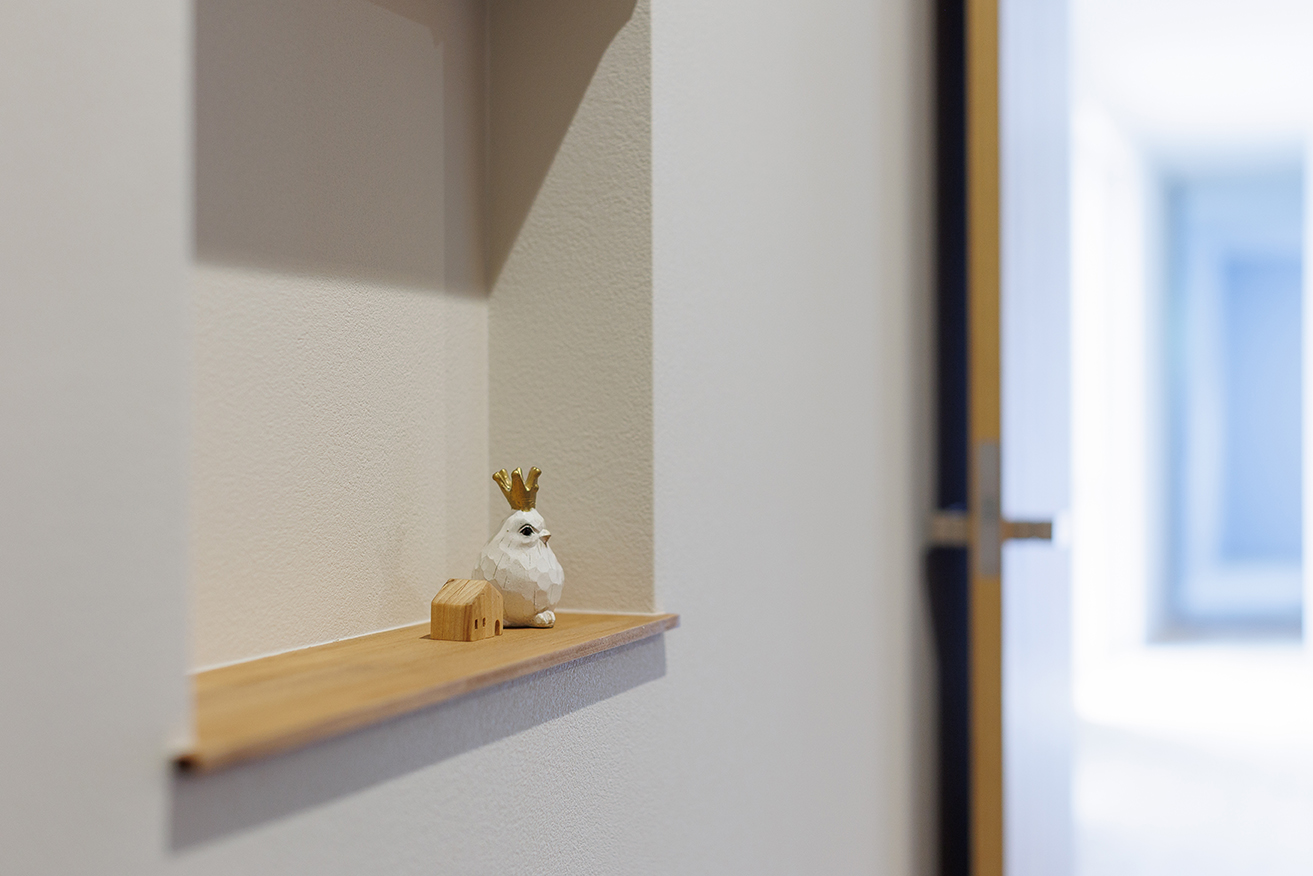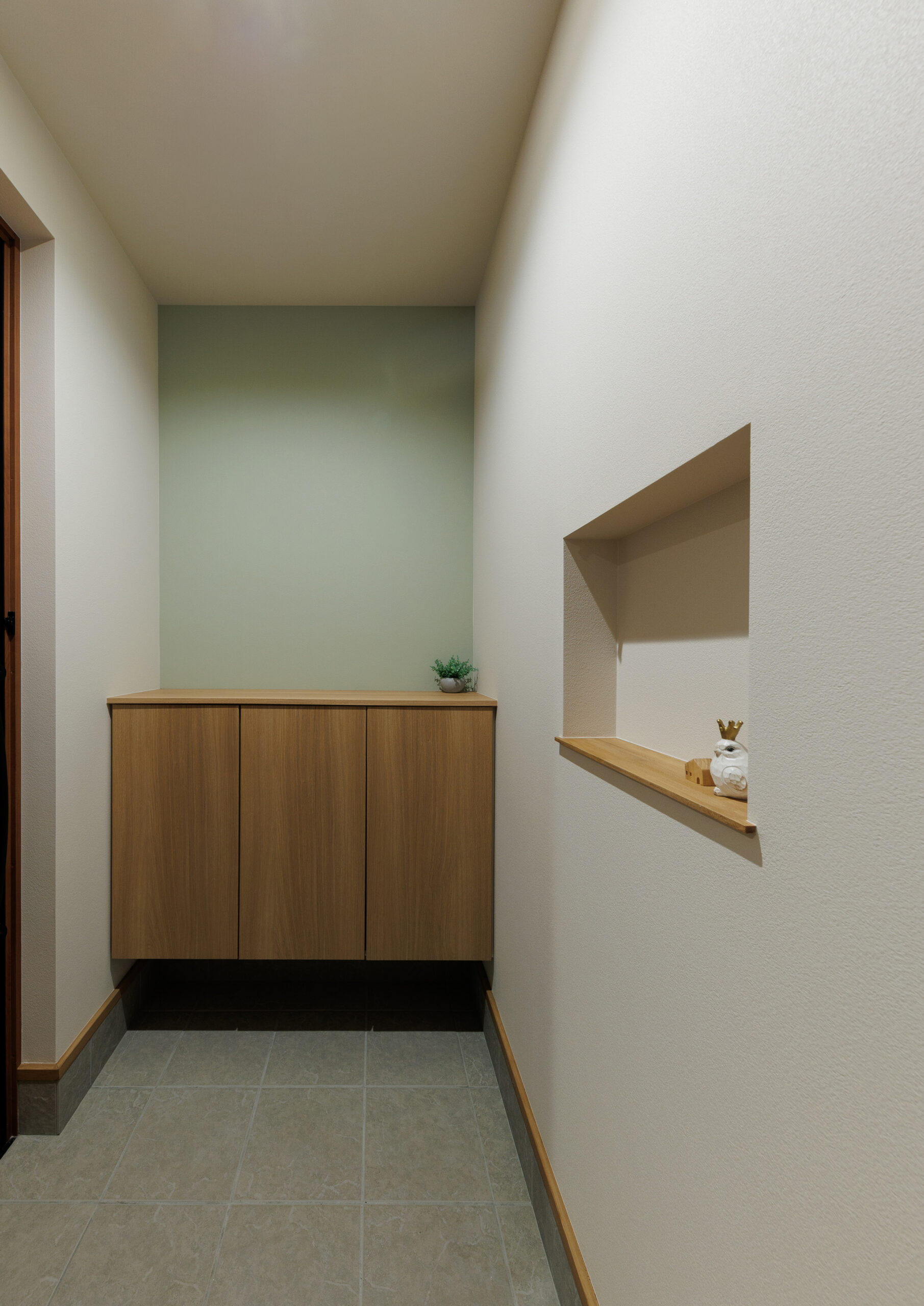 玄関開けて真正面にニッチを施工。お気に入りの花器や雑貨を飾れば、センスよくお客様をお出迎えできます。