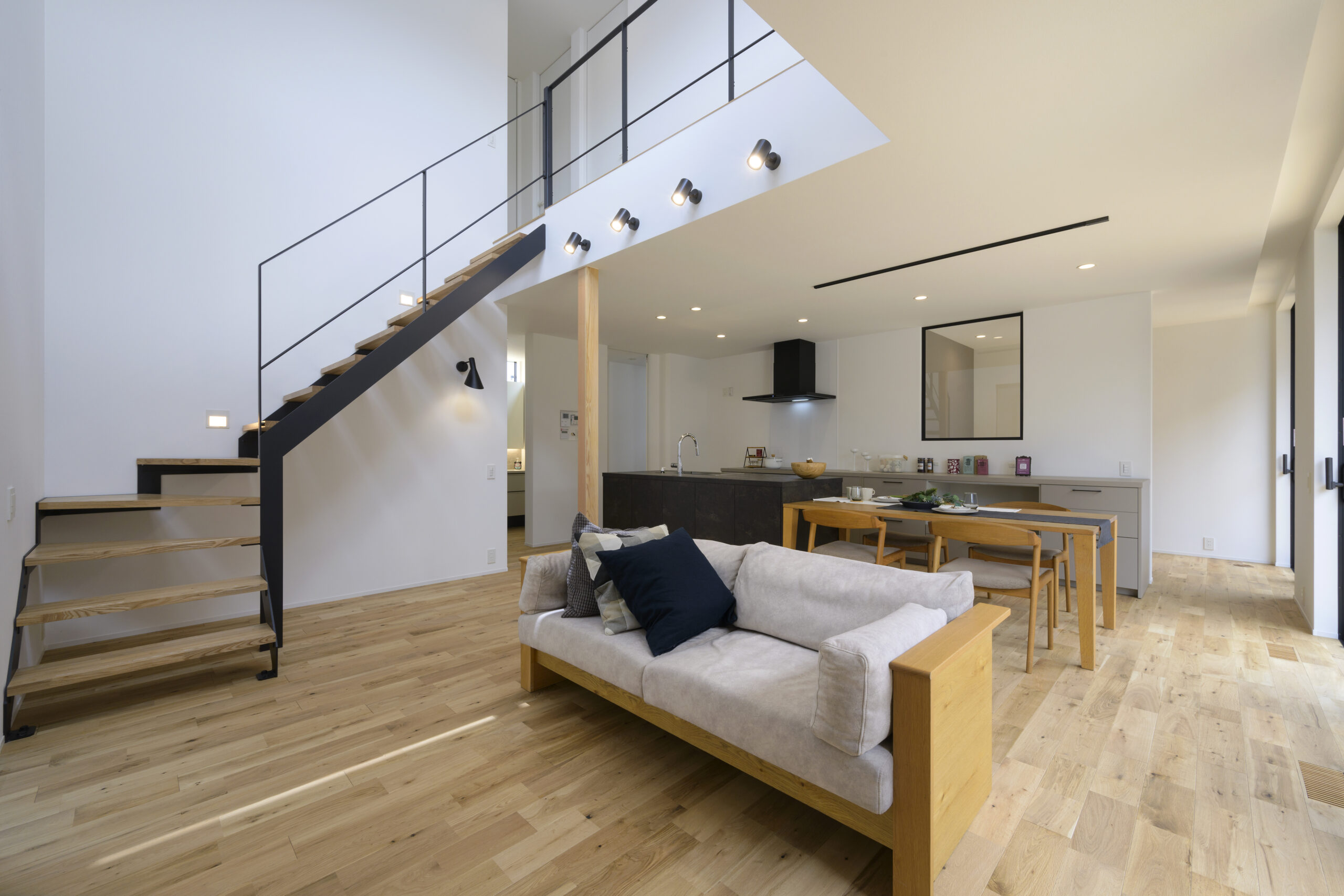 2階から光がLDKに降り注ぐように吹き抜けを施工しました。明るさと開放感のある室内に。