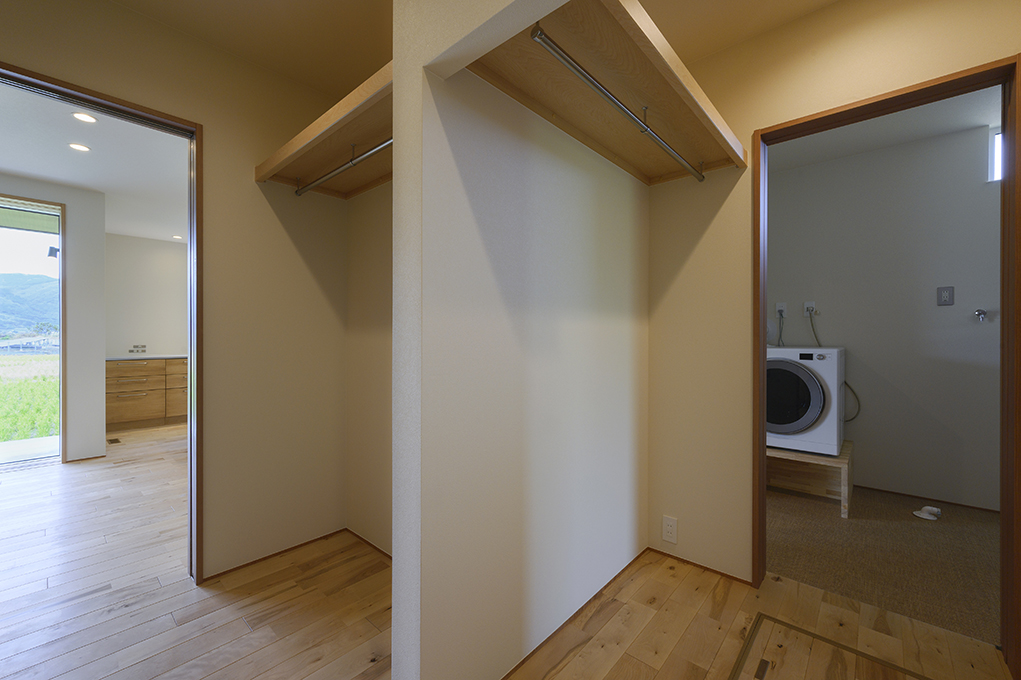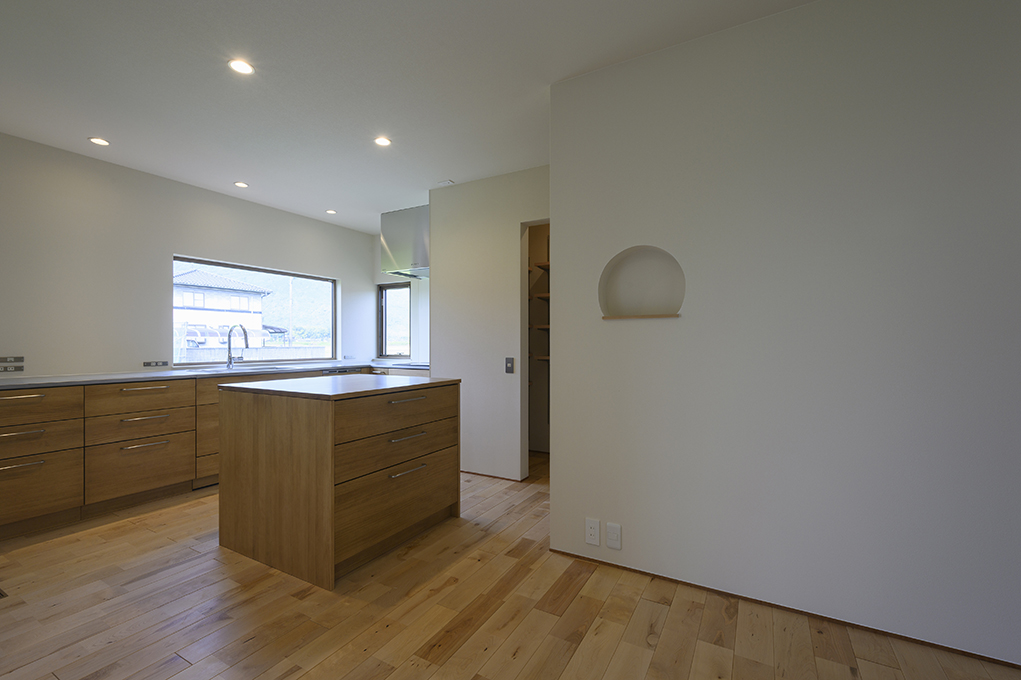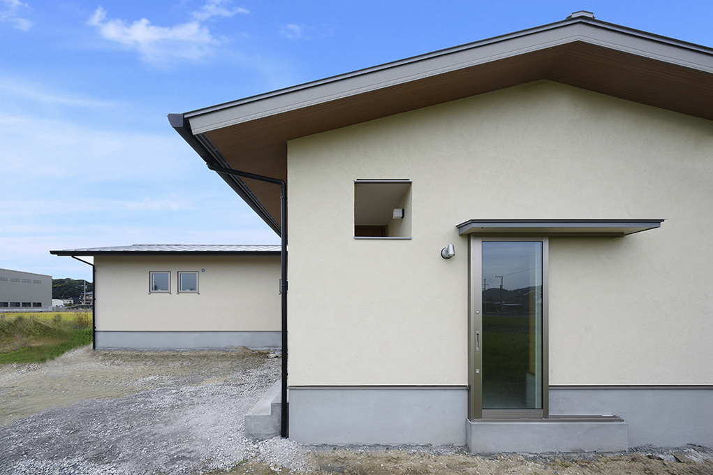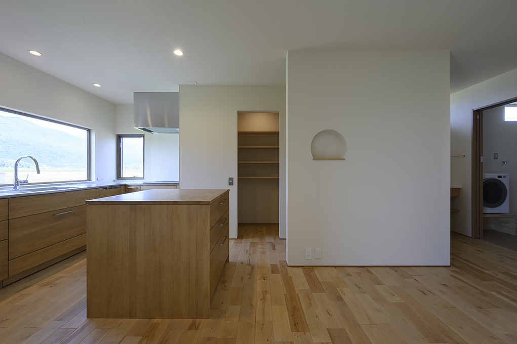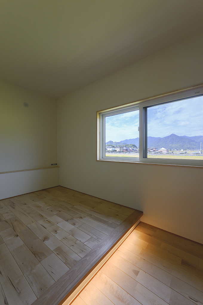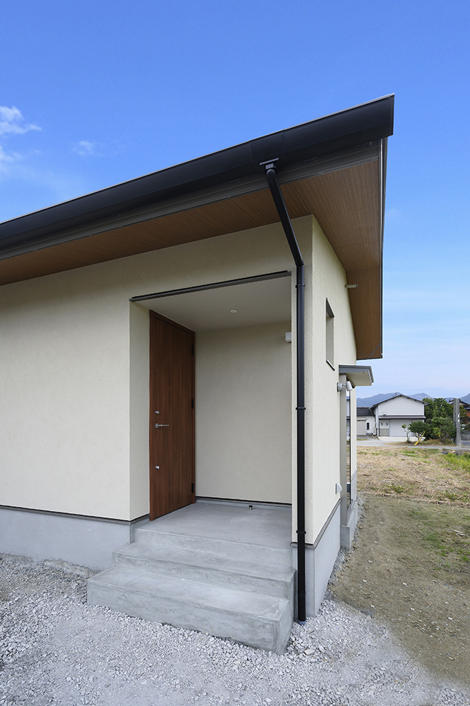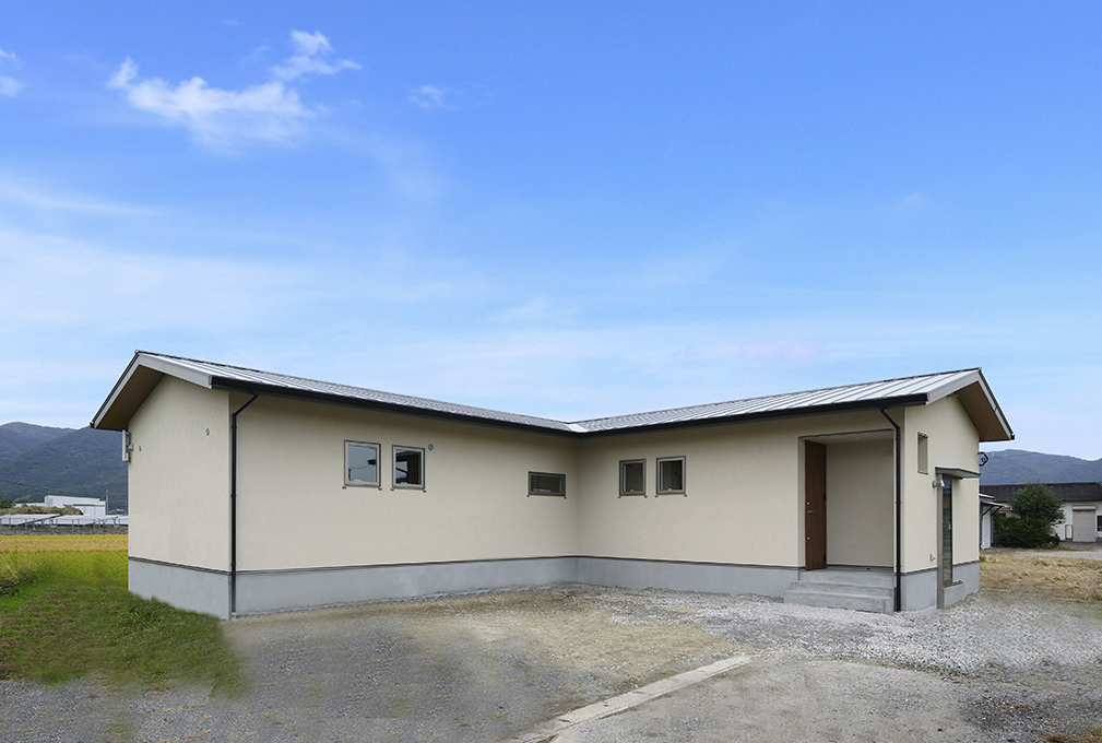 周囲の山並みやのどかな田園風景をいかした空間設計の借景の平屋。まるで額縁のように景色を切り取り室内に採り込み、ナカとソトの一体感を生み出しました。家で過ごす普段の時間が一番の幸せな時間へと変化します。