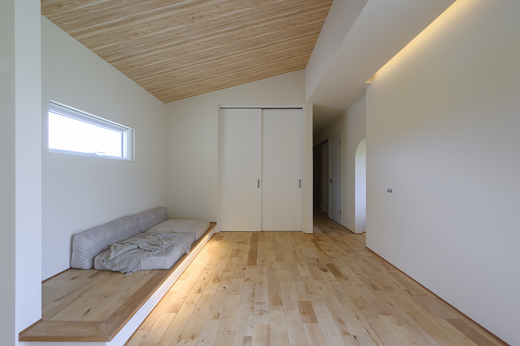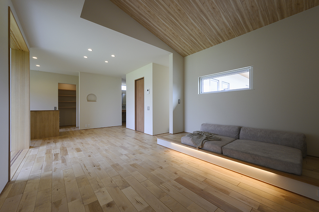 LDKの一部に設えたソファ置きスペース。小上がりになっているため、クッションを置けばソファがなくてもゆったりと座れます。下部には超光式の間接照明も備えているため、夜間など光を必要としないときにはやわらかく足元を照らすことができます。