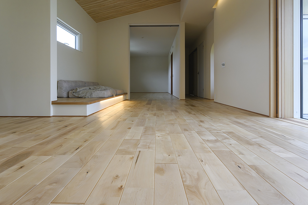 床材には赤みを帯びたカバ桜を採用しました。清潔感のある淡黄色と上品な木肌が特徴で、硬すぎず柔らかすぎない適度な弾力性を持っています。無垢材特有の「節」が少なく、均一な見た目をつくりやすいため、上品でスタイリッシュな雰囲気を演出できるのも人気を得ています。