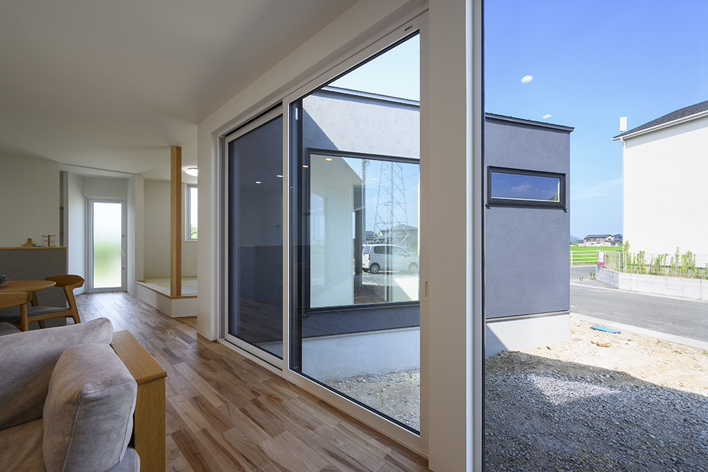 中庭を囲むように、“つ”の字型にレイアウトすることで、周囲の視線を遮りながら開放感を感じられます。日中はカーテンを開けっ放しにすることも可能です。