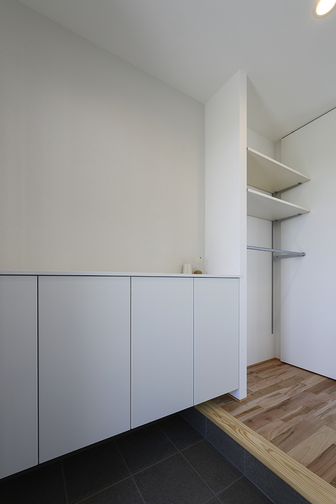 床から浮かしたフロートタイプの玄関収納。扉付きで収納物が見えないため、急な来客でも安心。さらに、床の拭き掃除もラクラクに。