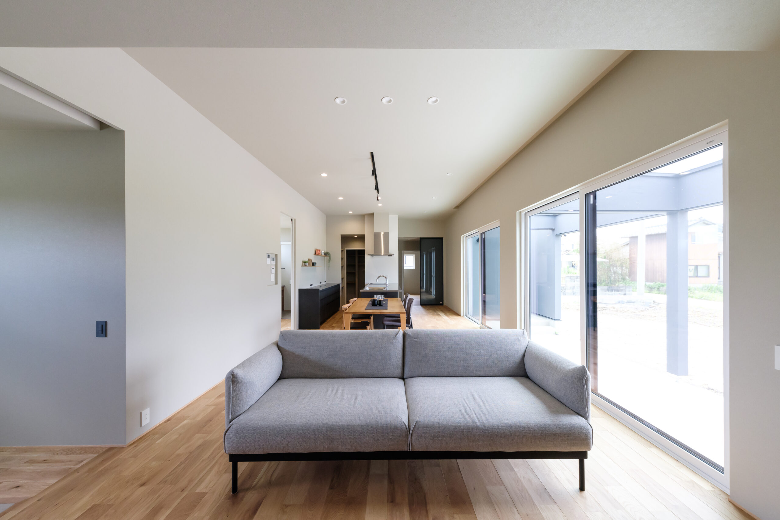 高天井にした開放感たっぷりの室内リビングと個室2つ分ほどのデッキを施したアウトドアリビング。居心地の良さと家での楽しみ方の幅が広がる究極のリビングで、家での過ごし方が無限大に!そして、極めつけは室内のリビングからデッキへの視線のヌケ感と見晴らしの良さ。遮るものがなく、圧倒的な開放感と眺望を楽しめる大空間の平屋です。